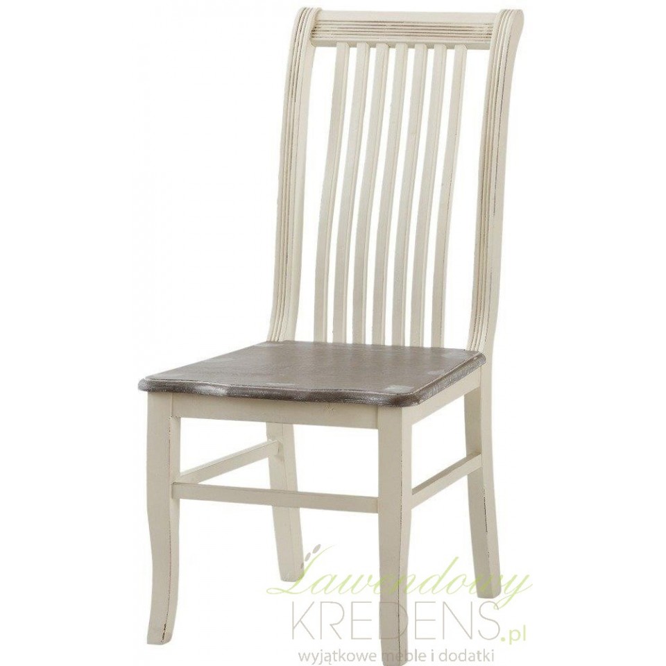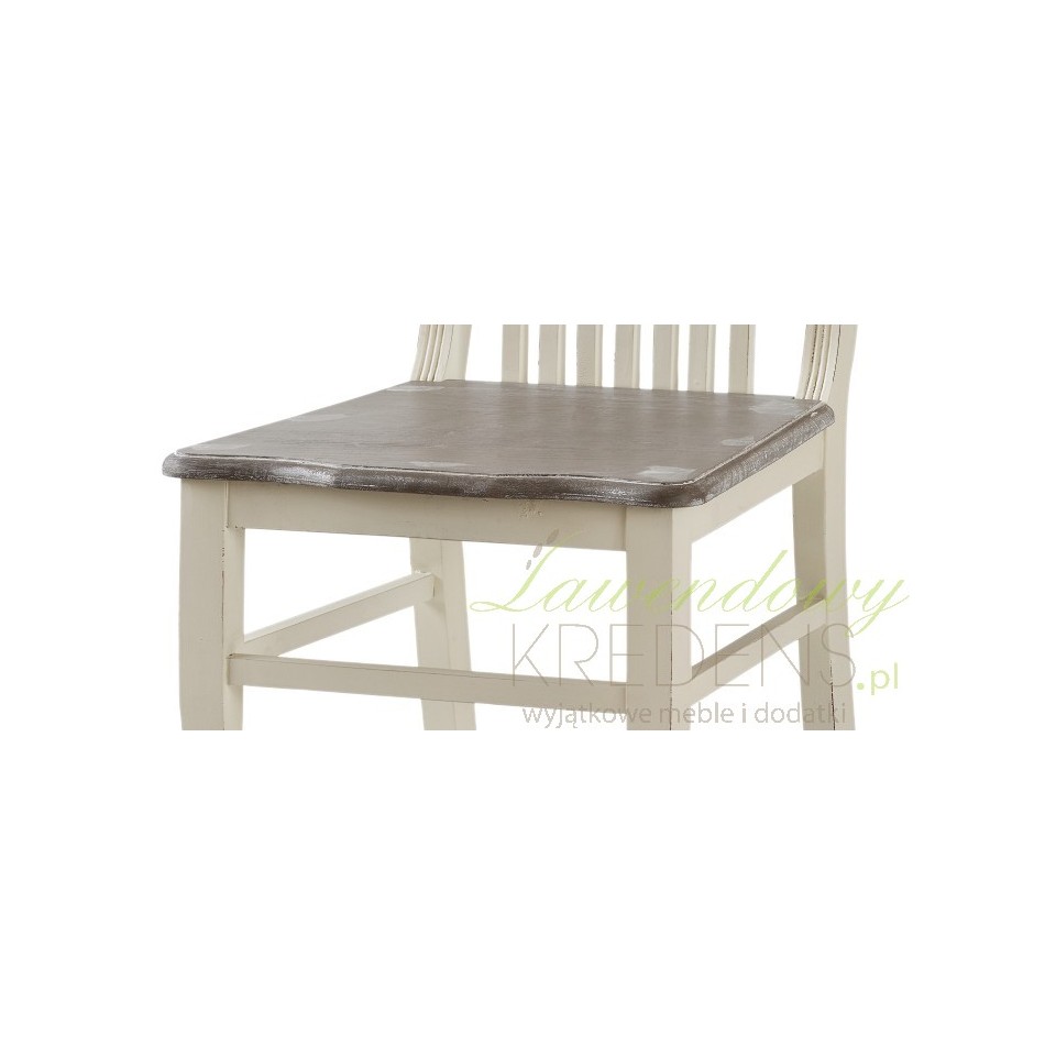 Krzesła prowansalskie w kolorze kremowym z przetarciami farby oraz z siedzeniem w odcieniu brązowo-szarym.