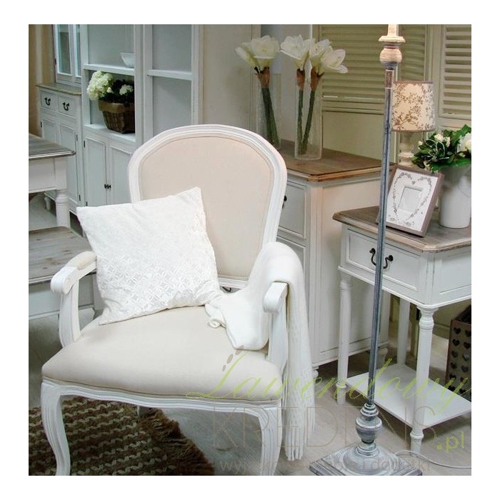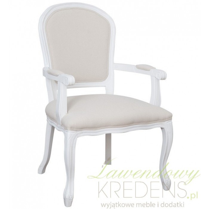 Białe krzesło prowansalskie w którego kształcie od razu widać francuską inspirację. Krzesło posiada przepiękne rzeźbienia wzdłuż każdej krawędzi i jasną tapicerkę nie tylko na siedzisku i oparciu, ale także na podłokietnikach. Dzięki temu krzesło jest bardzo eygodne i eleganckie w odbiorze. Krzesła świetnie komponują się z innymi meblami Livin Hill i nie tylko.