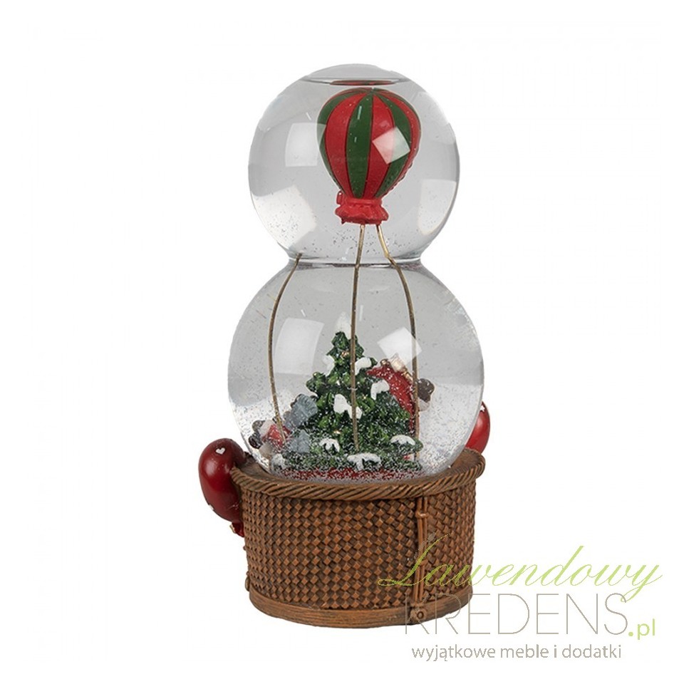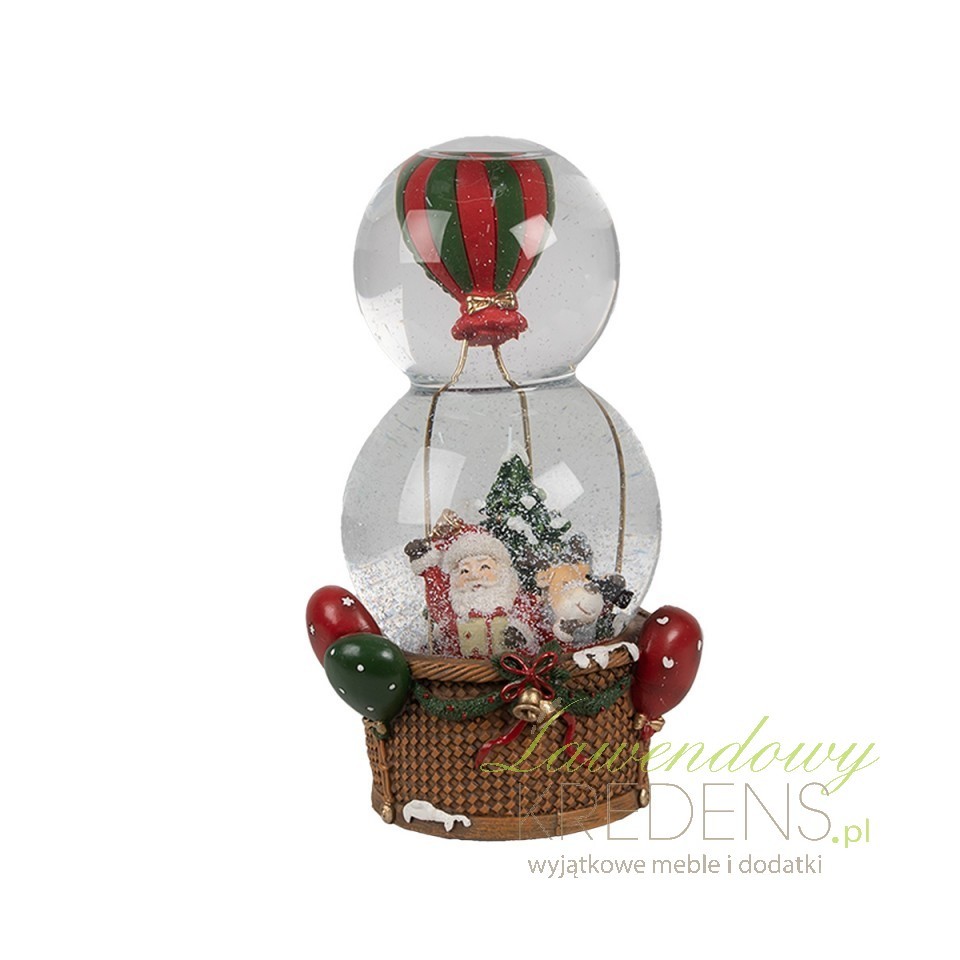 Kula śnieżna w której znajduje się mikołaj z reniferem w latającym balonie. Kolorystyka zielono - czerwona to iście świąteczne połączenie. Wyjątkowa dekoracja z grającą poytywką to pomysł na dopełnienie bożonarodzeniowej aranżacji.