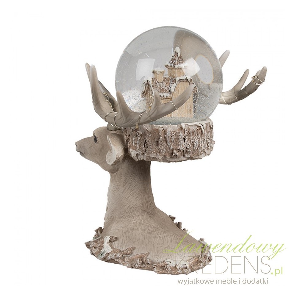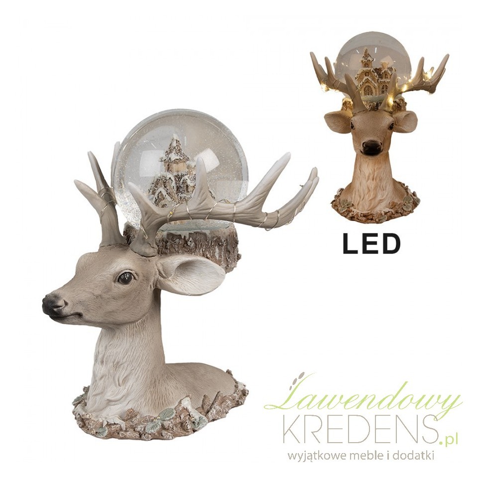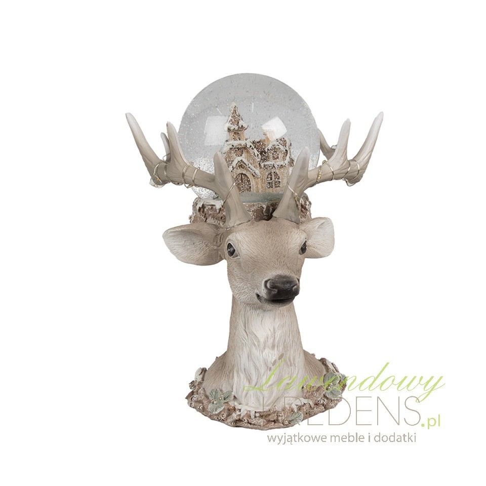 Szklana, bożonarodzeniowa kula śnieżna umieszczona na ozdobnej podstawie w kształcie głowy jelenia, w której kryje się miniaturowa, malownicza scena. Kula posiada oświetlenie LED, które dodaje jej dodatkowego, świątecznego uroku, a Twojemu domowi nada bożonarodzeniowego klimatu.
