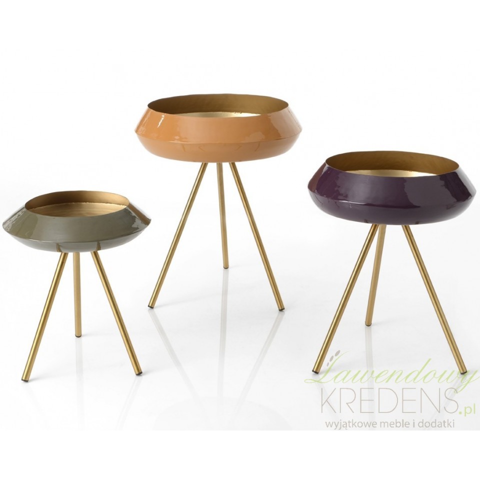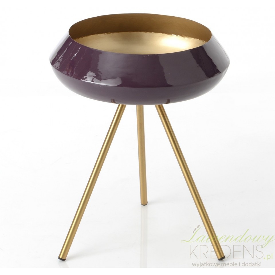 Kwietnik na złotych nóżkach to jeden z najbardziej atrakcyjnych w naszym sklepie, element wyposażenia wnętrz, tarasów i balkonów, dla osób, które wiedzą jaki efekt aranżacyjny chcą uzyskać. Na początku swojej podróży aranżacyjnej zadbaj o to, by w domu znalazło się odpowiednie miejsce na kwiaty. Metalowy kwietnik składa się z prostych nóżek w kolorze złotym i z fioletowej misy. Takie połączenie kolorów z pewnością wywoła efekt wow!