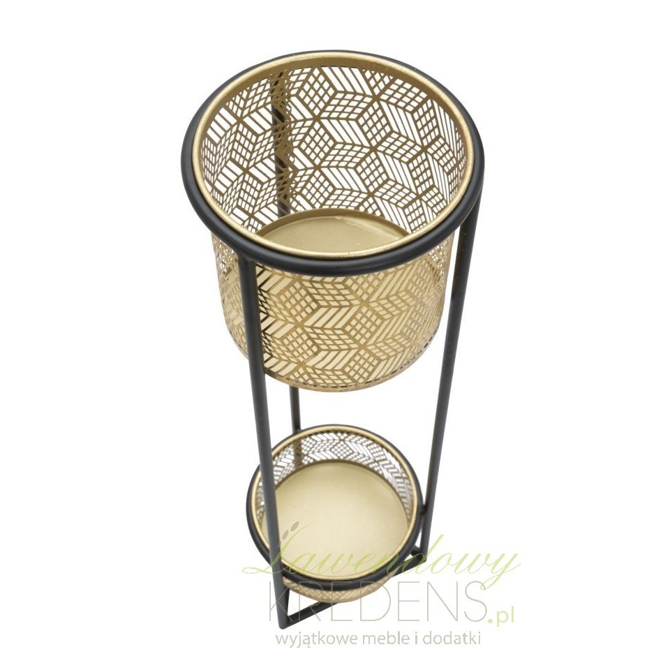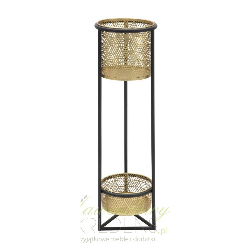 Jeśli kochasz kwiaty to z pewnością pokochasz również kwietniki metalowe od Mauro Ferretti. Prezentowany kwietnik ma długie na 80 centymetrów nogi oraz dwie osłonki zamocowane jedna przy podstawie, a druga na szczycie kwietnika. Obie osłonki są okrągłe, wykonane z metalowej blachy, na którą z kolei naniesiono ażurowy, regularny wzorek. Złoto w połączeniu z czernią sprawia, że metalowy kwietnik to szykowny dodatek nie tylko do eleganckiego wnętrza.