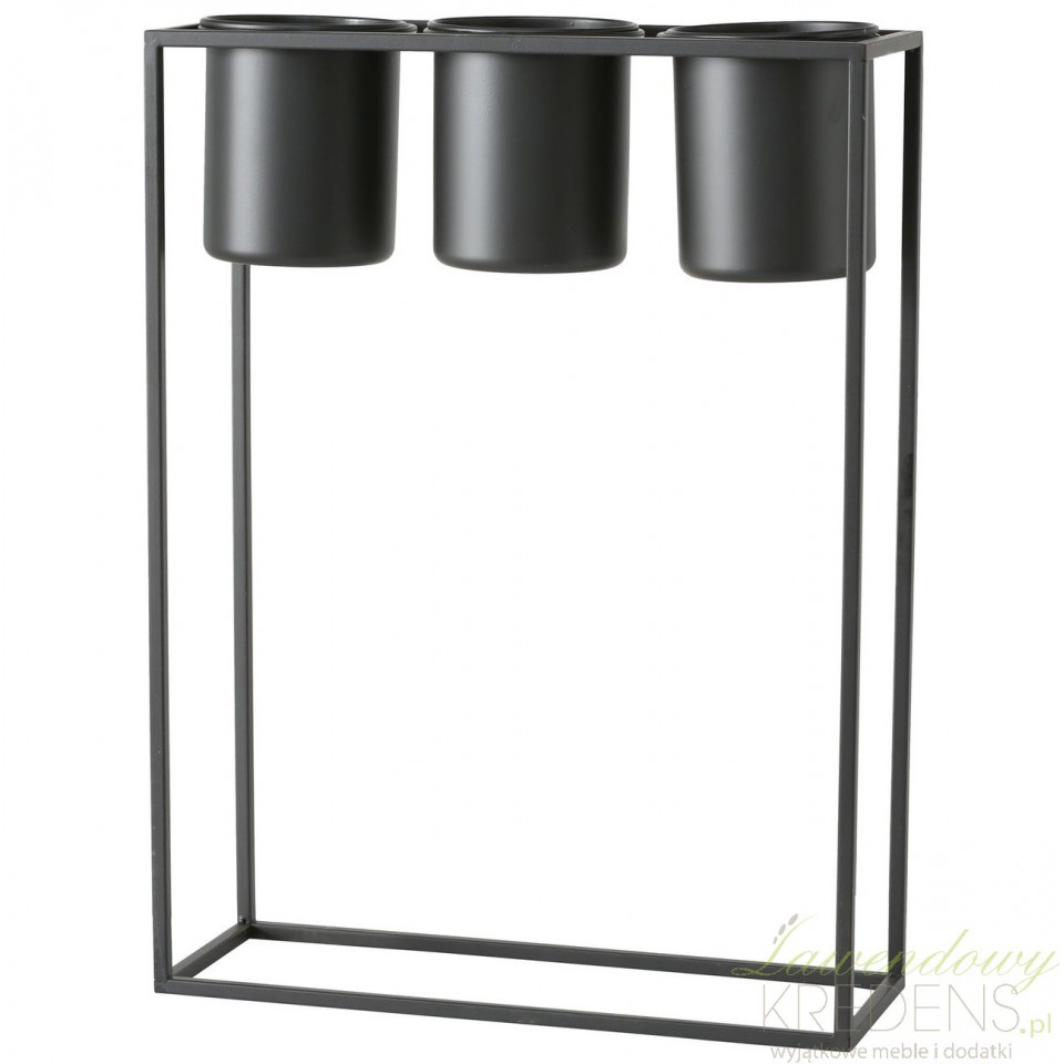 Czarny kwietnik w stylu industrialnym wykonano z metalu i wyposażono w miejsce na trzy donice z dowolnymi roślinami.