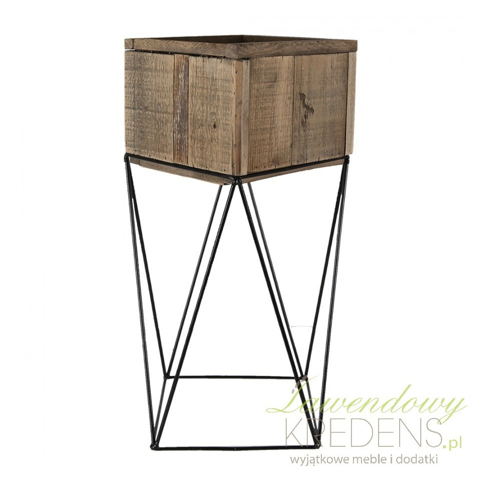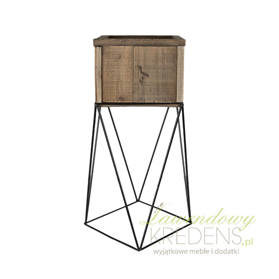 Kwietnik dekoracyjny z metalową podstawą w czarnym kolorze, zaś jego góra wykonana jest z brązowego drewna. Praktyczna dekoracja, która dzięki swojej surowego wykończenia będzie doskonale pasować np do stylu rustykalnego.
