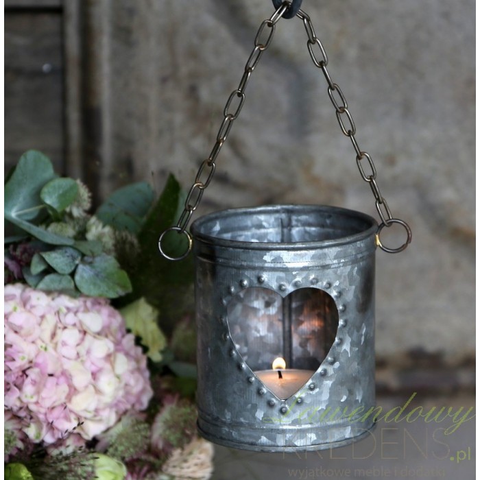 Metalowy lampion w stylu prowansalskim z sercem na przodzie i łańcuszkiem, który umożliwi jego zawiesznie