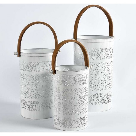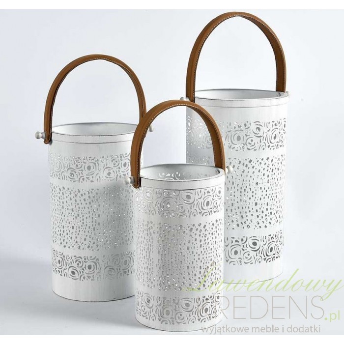 Lampiony od firmy Belldeco to zestaw trzech oryginalnych osłonek na świece w różnych rozmiarach. Lampiony ażurowe są białe i mają brązowe uchwyty. Metalowe lampiony doskonale prezentują się jako element dekoracyjny. Dzięki nim stworzych ciekawe aranżacje i unikalną atmosferę. Lampiony na świece, które będą pięknym dopełnieniem każdej aranżacji wnętrza!