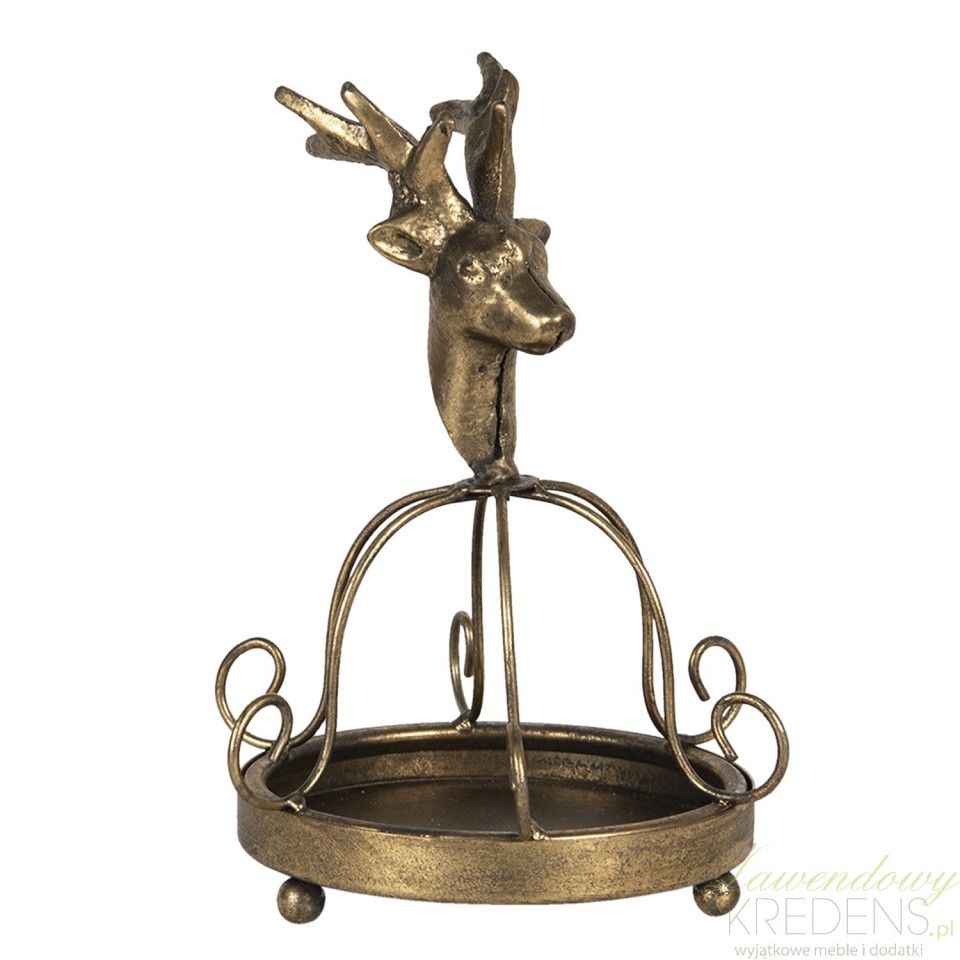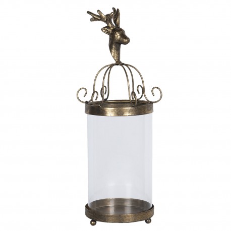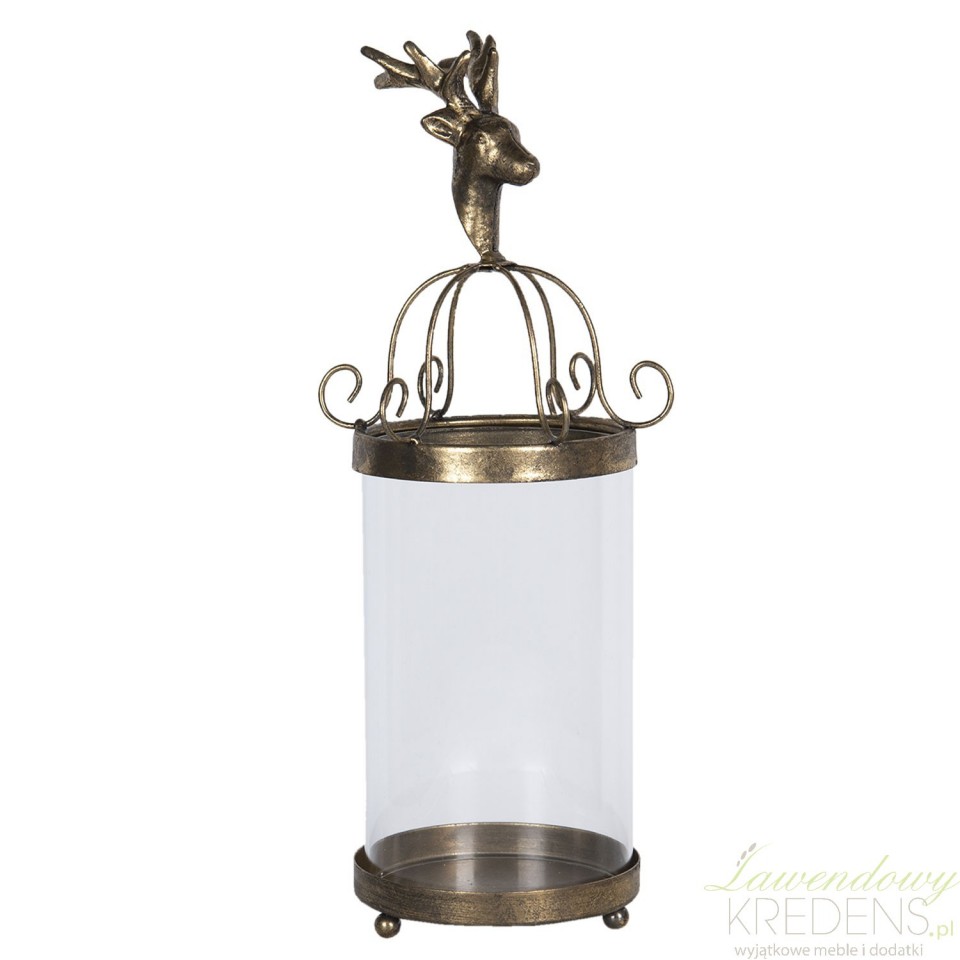 Szklany lampion z jeleniem wywoła w Twoim domu klimatyczną aurę. Lampion wykonany został ze szkła i zabezpieczony metalową podstawą oraz ozdobiony przykrywką, która jest metalowa i ma kształt poroża jelenia. Metalowe elementy mają miedziany, ciepły odcień. Wykorzystaj wolne chwile na poszukiwanie pięknych dodatków do swojego domu, a przy okazji sprawdź najpiękniejsze lampiony od Clayre&Eef.