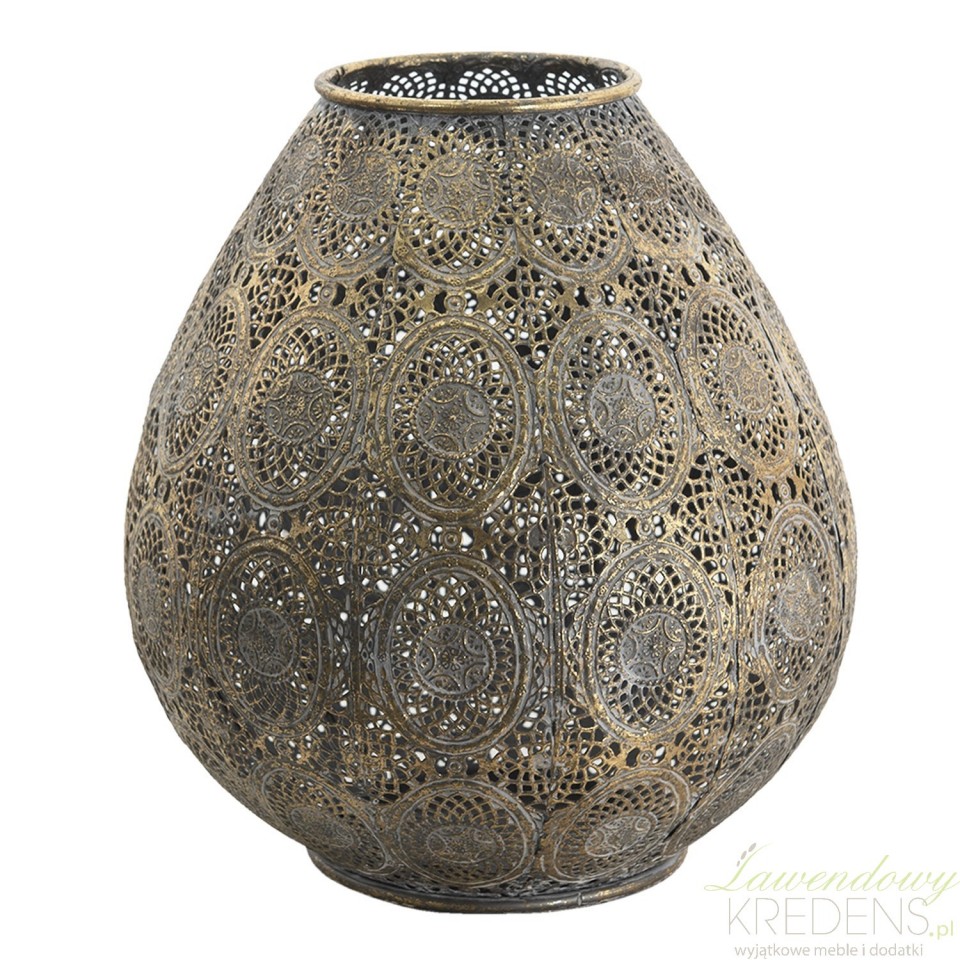 Ażurowe lampiony od Clayre & Eef nadają magiczny charakter każdemu pomieszczeniu, a co więcej mogą stanowić także ciekawą opcję oświetlenia tarasu lub balkonu. Ażurowy lampion antyczny mosiądz to dodatek, za pomocą którego wykreujesz niezrównaną atmosferę, wystarczy, że umieścisz w nim płonącą świecę lub tealight, a światło wydostając się przez mikrootwory otuli przestrzeń wokół. Lampion wykonany z metalu to gwarancja trwałości i świetnego wyglądu na okrągło! Nie czekaj - Twoje wymarzone dodatki do pokoju czekają na Ciebie w naszym sklepie!
