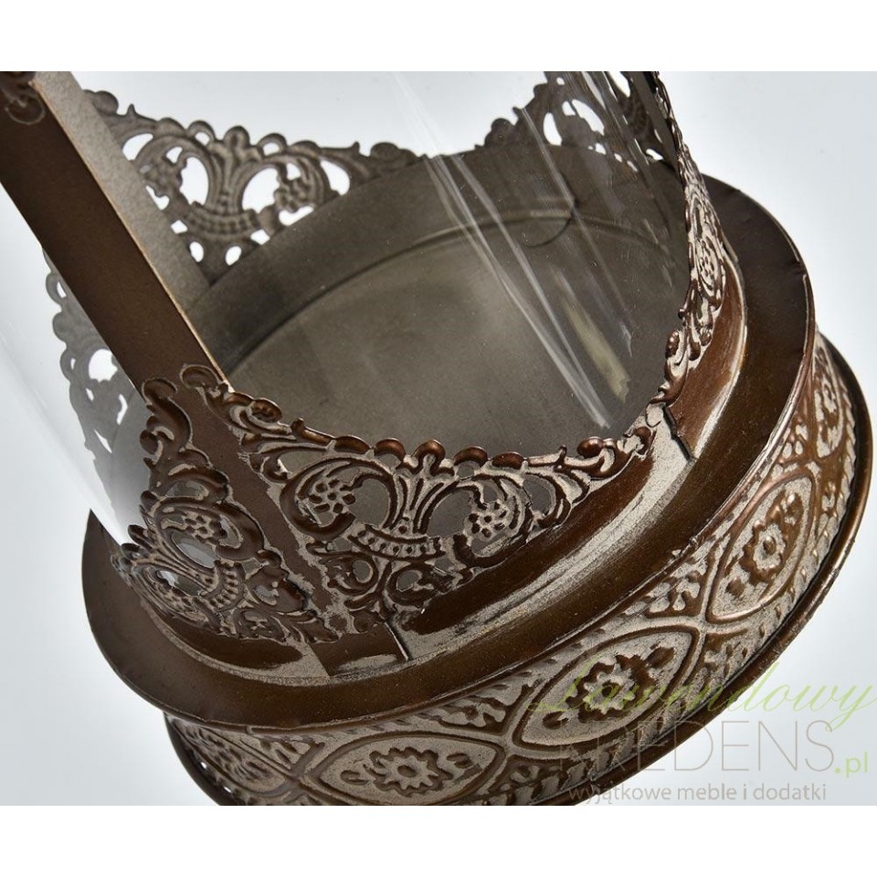 Jets to zamykany od góry na haczyk lampion szklany, który dzieki uchwytowi można łatwo przenosić. Czar całej kompozycji stanowi metalowa obudowa z licznymi, precyzyjnie wykonanymi zdobieniami z motywami roślinnymi. Światło świec dzięki takie oprawie będzie świeciło intensywniej i efektowniej.
