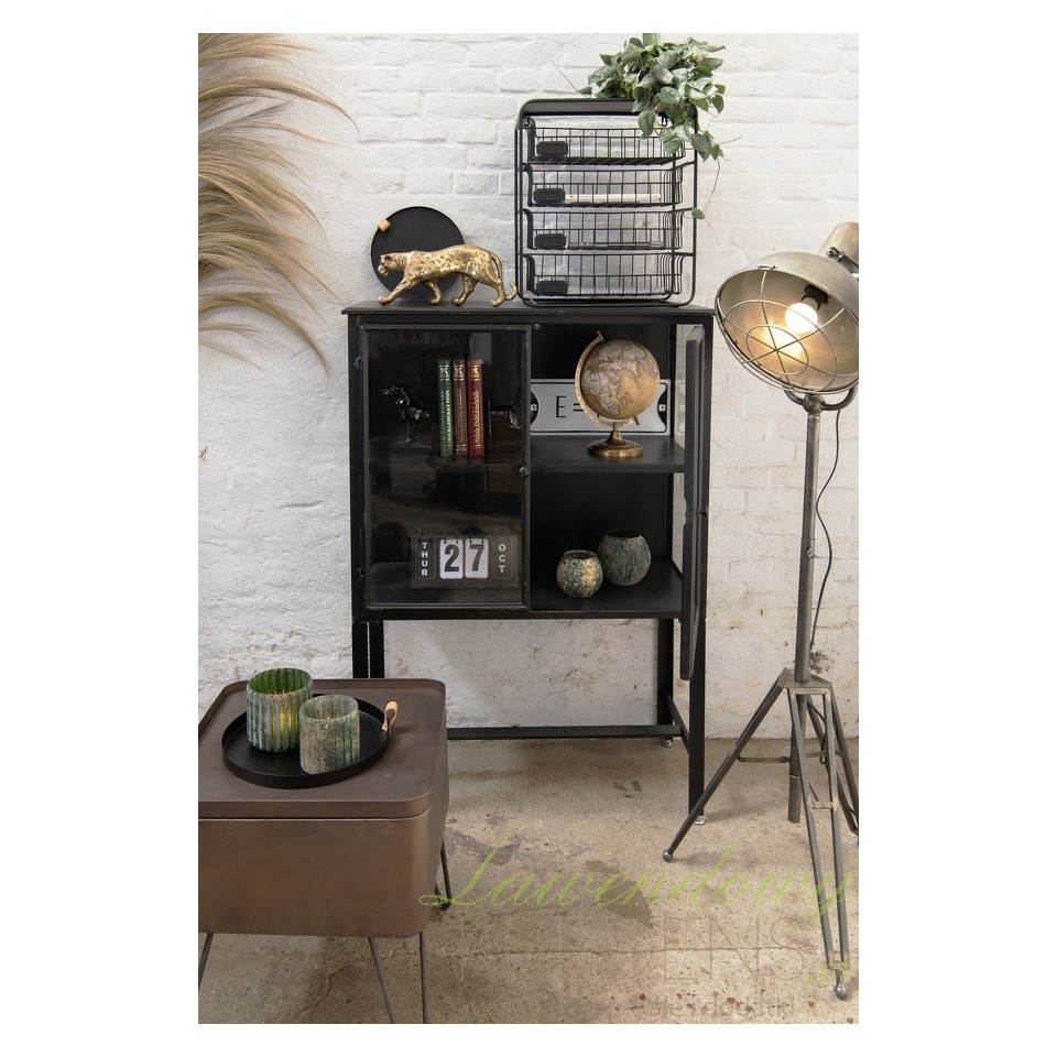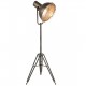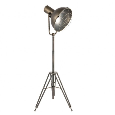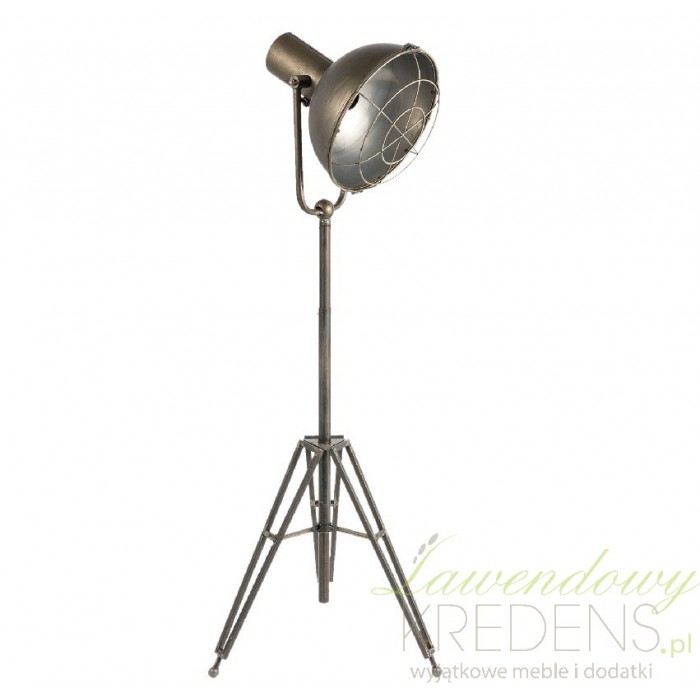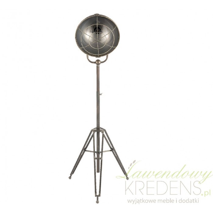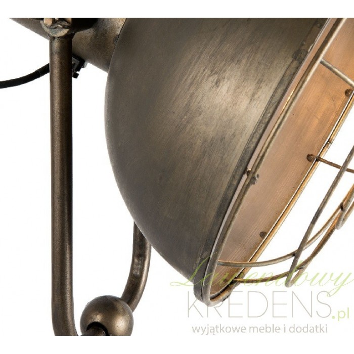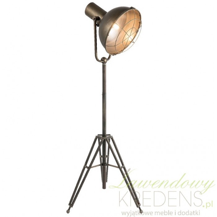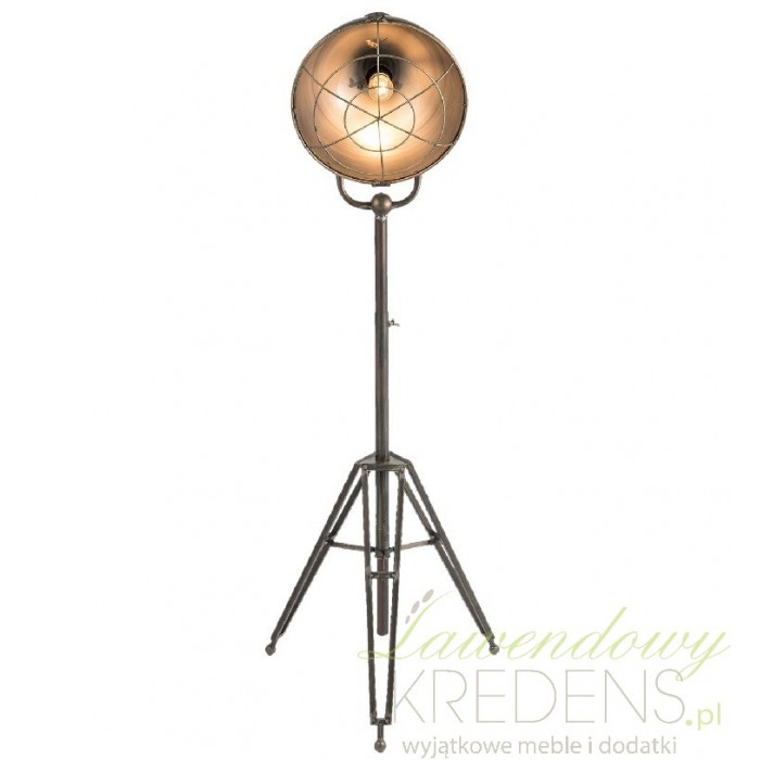 Lampa podłogowa wykonana z metalu zbudowana jest z półokrągłego klosza i stabilnego statywu. Trójnóg stanowiący podstawę lampy został wykonany z kilku metalowych prętów przez co zapewnia najwyższy poziom równowagi lampy. Żarówka przysłoniona metalowym kloszem z jednej strony, z drugiej ma zamocowaną klatkę przez co tworzy idealny element wyposażenia industrialnego wnętrza. Wysokie lampy w stylu industrialnym świetnie sprawdzają się wieczorową porą w salonie, gdzie najczęściej odpoczywamy po pracy czytając ulubioną lekturę.
