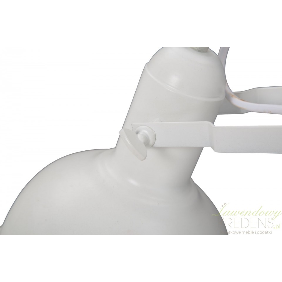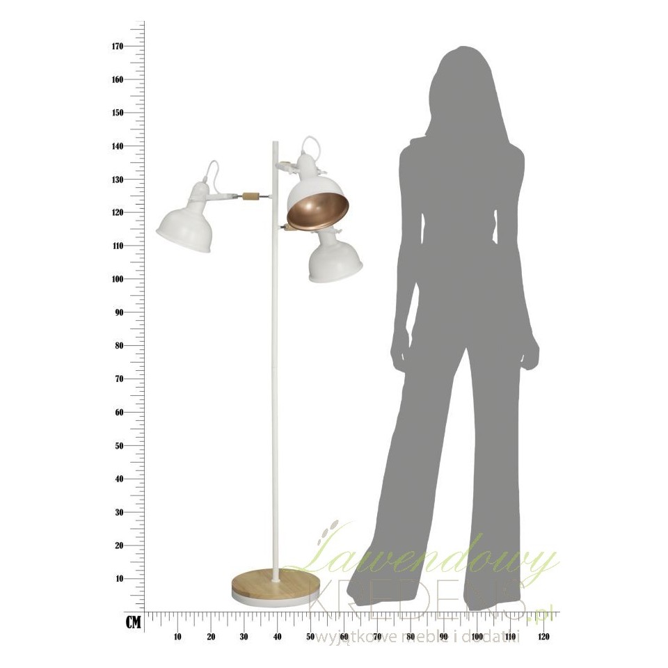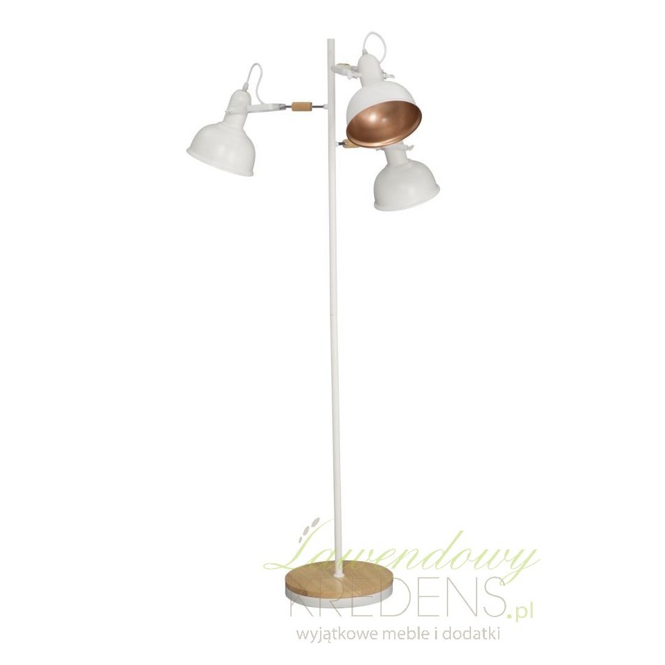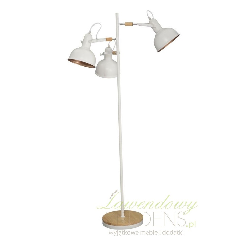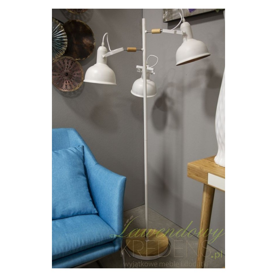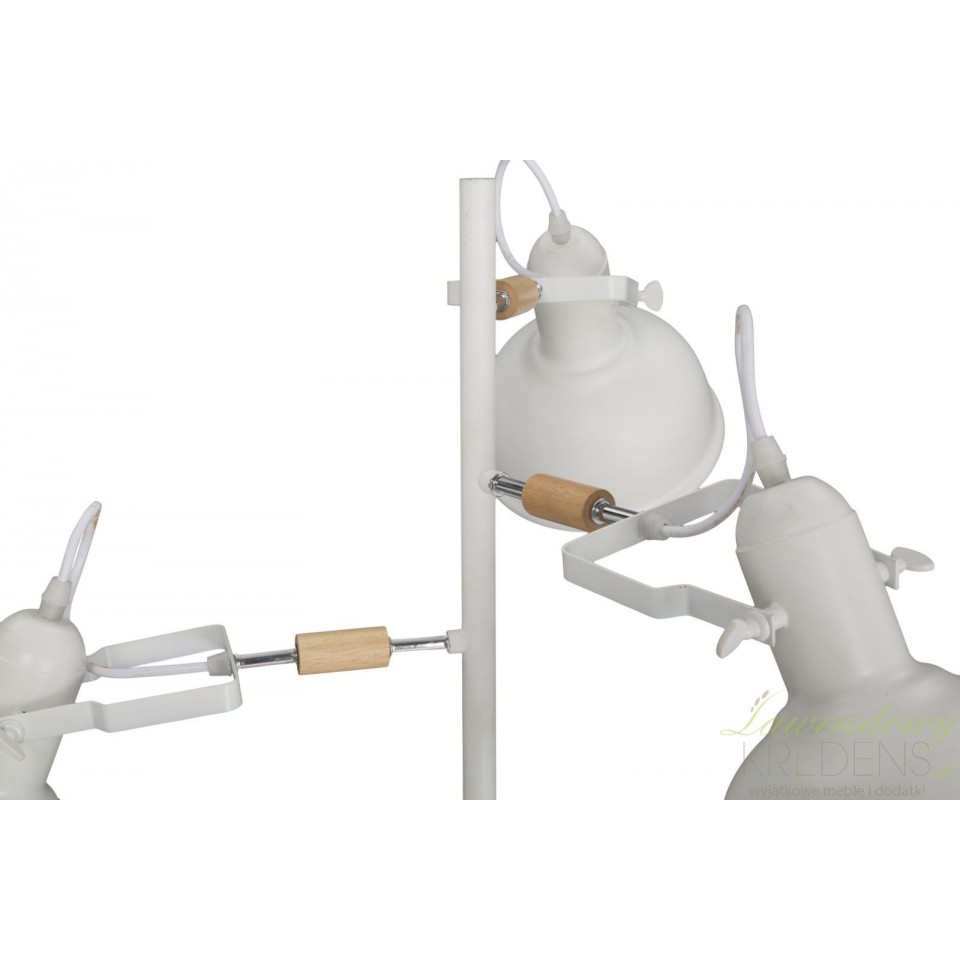 Metalowa lampa podłogowa w kolorze białym wyposażona jest w trzy klosze i okrągłą podstawę zrobioną z drewna.