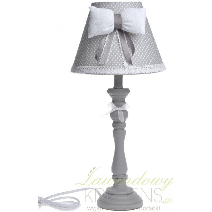 Lampa w stylu prowansalskim w pięknym szaro-beżowym kolorze holenderskiej produkcji. Lapa prowansalska ma podstawę wykonaną z drewna oraz bawełniany abażur do którego przyczepiona jest urocza kokarda. Lampka prowansalska to kwitensencja tego stylu. Można ją postawić na stoliku nocnym lub komodzie. Doskonale sprawdzi się w pokoju dziecięcym lub w salonie!