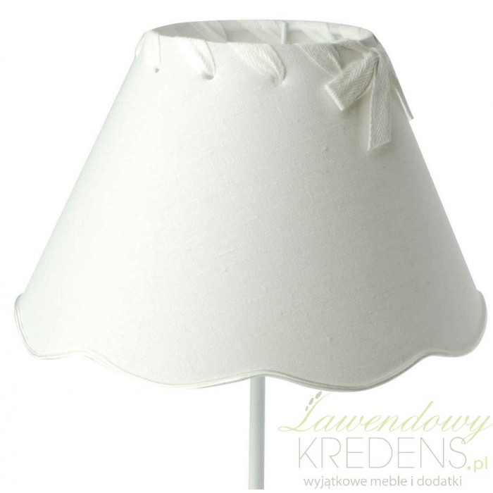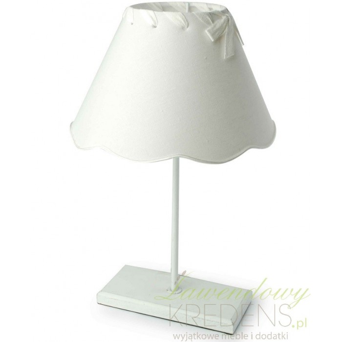 Biała lampka prowansalska, której główną ozdoe stanowi uroczy, biały abażur. Abażur ten wykonany jest z bawełny, a jego górna krawędź jest ozdobiona bawełnianą tasiemką zawiązaną na kokardkę. Dolna krawędź abażura ma natomiast falowaną linię. Dzięki prostokątnej, drewnianej podstawie lampka stoi bardzo stabilnie. Lampki w stylu prowansalskim, uroczo się prezentują, są nie tylko źródłem światła, ale także prześliczną ozdobą wnętrza.