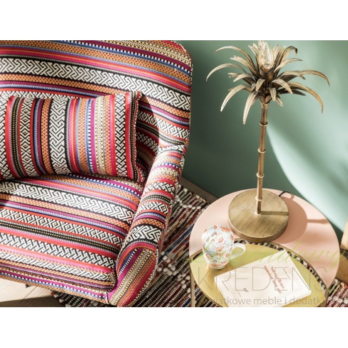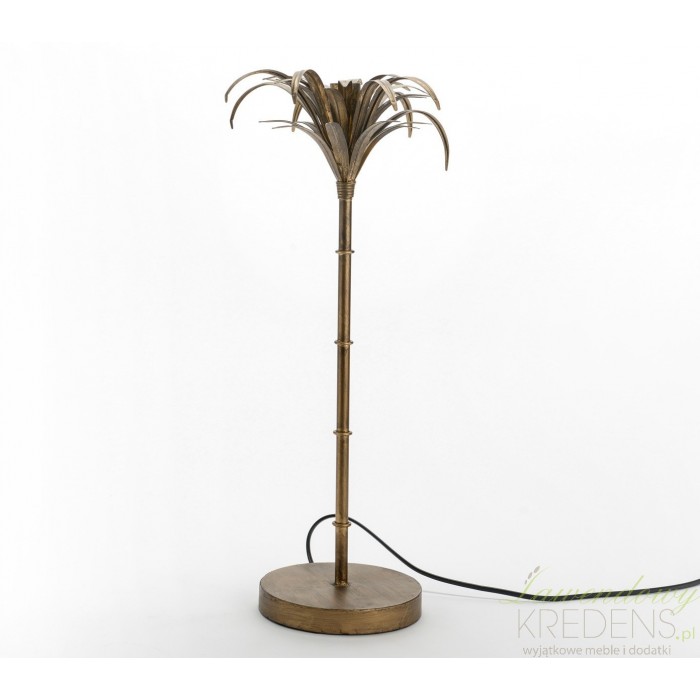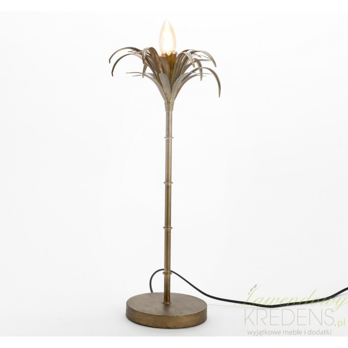 Metalowa lampa stołowa w kształcie palmy z kloszem w formie długich, wygiętych ku dołowi liści. Kolor starego złota sprawia, że lampa genialnie sprawdza się w połączeniu z drewnem i metalem. Lampa oświetli wnętrze ale będzie też egzotyczną ozdobą szafki nocne lub biurka. Polecamy także pozostałe lampy stołowe od renomowanej, francuskiej marki.