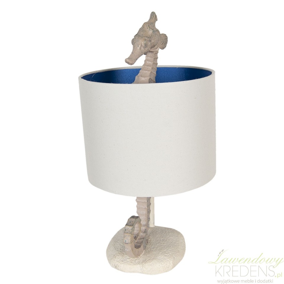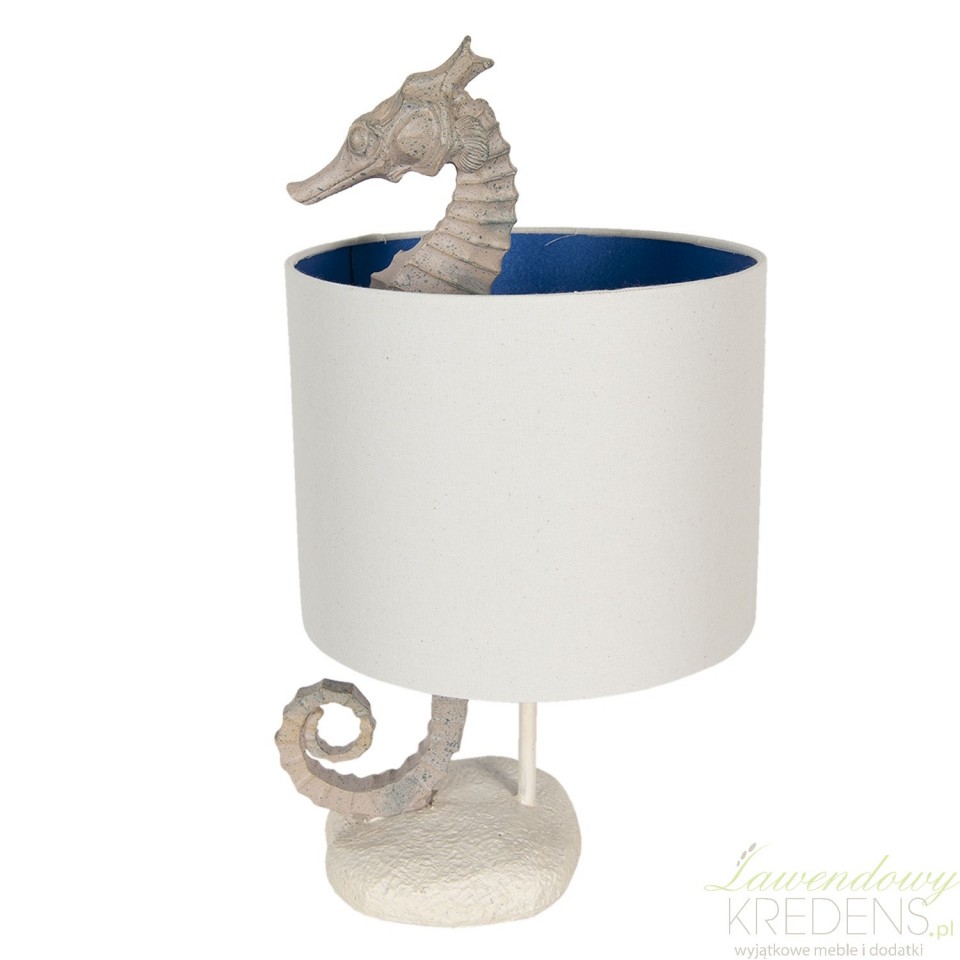 Lampa stołowa z konikiem morskim została wykonana z materiałów najwyższej jakości. Biały, okrągły abażur doskonale rozprasza światło, a co więcej zapewnia wokół przyjazny nastrój. Dodatkowo zdobiony jest szarą figurką konika morskiego, którego głowa i ogon wyłaniają się z wnętrza abażura. Dodatki w stylu marynistycznym polecamy przede wszystkim do wyposażenia nadmorskich hoteli i apartamentów. Lampy w stylu marynistycznym sprawią, że Twoi goście będą oczarowani i zapamiętają czas spędzony w Twoim ośrodku na bardzo długo!