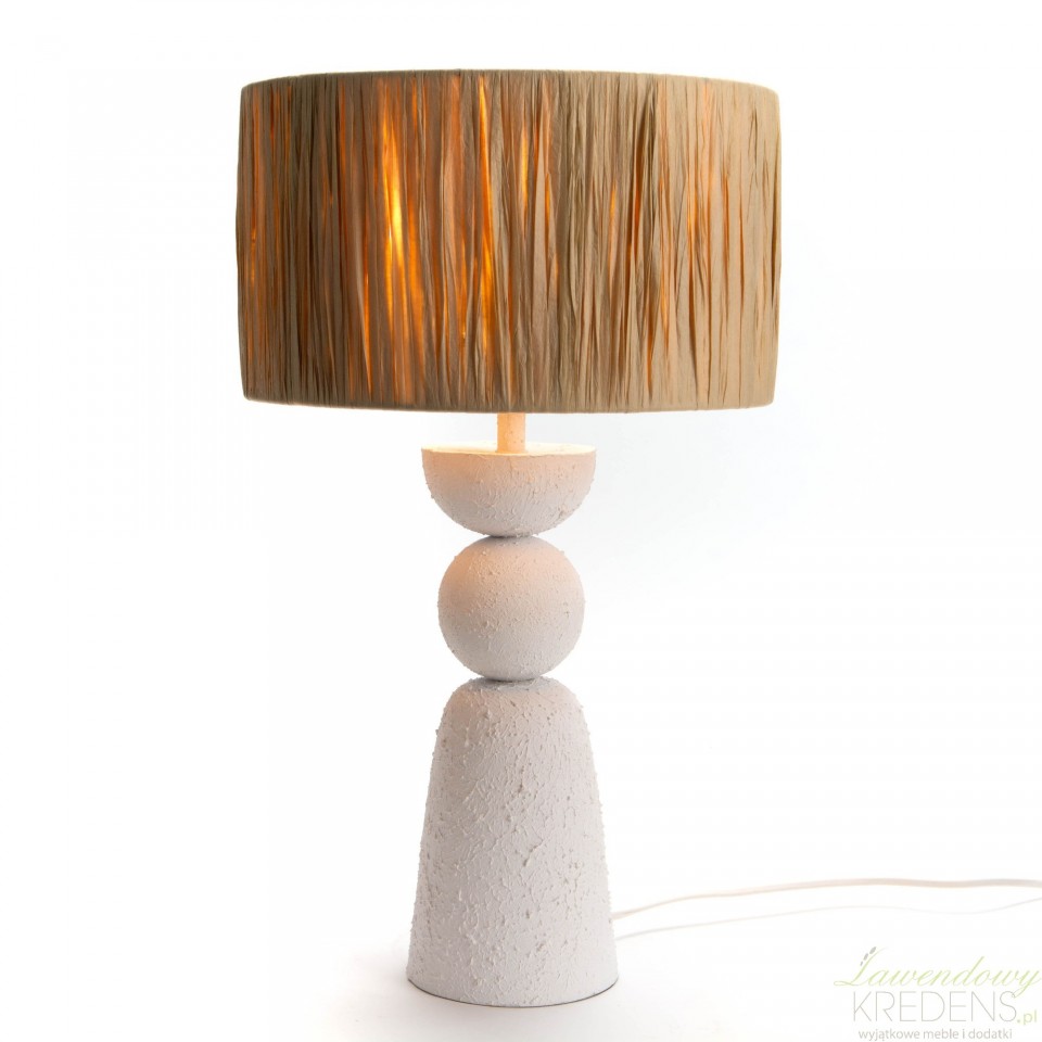 Wyposażona w podstawę w kształcie połączonych ze sobą figur geometrycznych, lampa stołowa Rafia z okrągłym, marszczonym kloszem, idealnie odzwierciedla wyrafinowany design z subtelnymi detalami. Ten model ma oszałamiające, biało-brązowe wykończenie, które pięknie się ze sobą łączy, rozświetlając Twój dom naturalnym blaskiem, który wszyscy będą podziwiać. Cechą charakterystyczną tej lampy jest chropowata powierzchnia podstawy. Ozdobne lampy stołowe od francuskiej marki sprawią, że wnętrza nabierają ciepłego, zachęcającego do relaksu wyglądu.