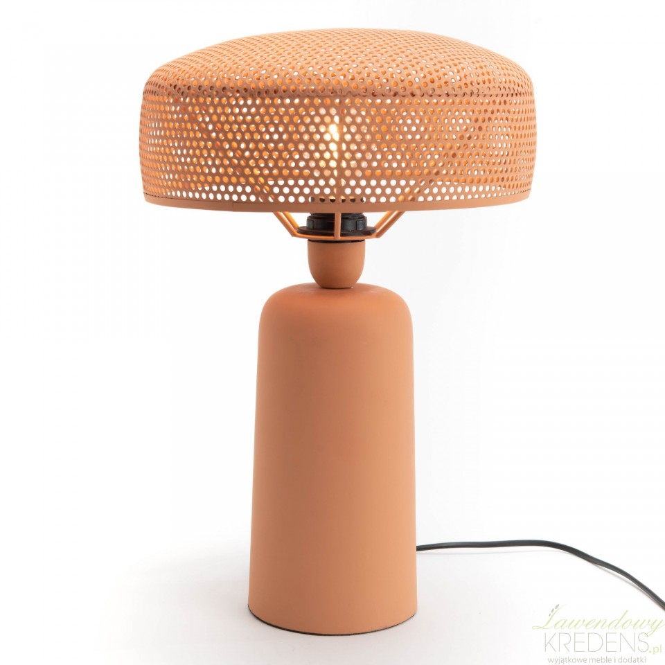 Brązowo-pomarańczowa lampa stołowa retro jest wykonana z metalu w matowym wykończeniu i ma wygląd grzybka, z długą nogą i okrągłym kloszem. Użycie perforowanego klosza to doskonały pomysł na dodanie lampie oryginalności. Ta lampa ma ponad 40 centymetrów wysokości, więc z pewnością będzie stanowić ważny element na stoliku kawowym, w salonie lub na konsoli w przedpokoju. Lampy stołowe w kształcie grzybka od francuskiego producenta są dostępne w kilku modnych kolorach!