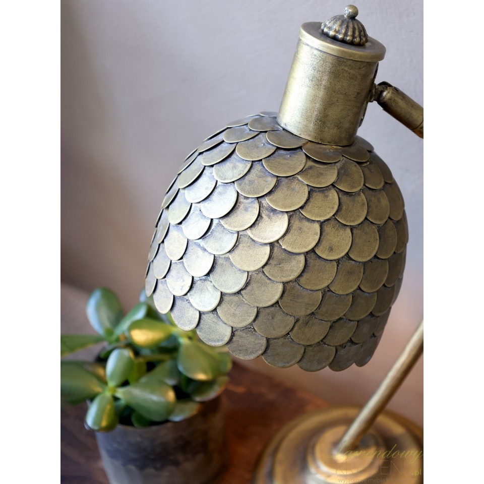 Spokój, harmonia i niepowtarzalny design - Twoje wnętrze zyska to i wiele więcej, gdy tylko pojawi się w nim lampka stołowa w stylu skandynawskim. Metalowa lampa w kolorze mosiądzu ma okrągłą podstawę i oryginalny klosz ozdobiony małymi elementami w kształcie rybich łusek. Skandynawski styl ewoluuje wokół czystego i uporządkowanego życia, ściśle trzymając się równowagi i porządku. Lampki stołowe skandynawskie od Chic Antique to kolekcja, która jest eksploracją i rozszerzeniem tej ideologii. Połącz je z drewnianymi meblami aby uzyskać niebanalny wygląd wnętrza.