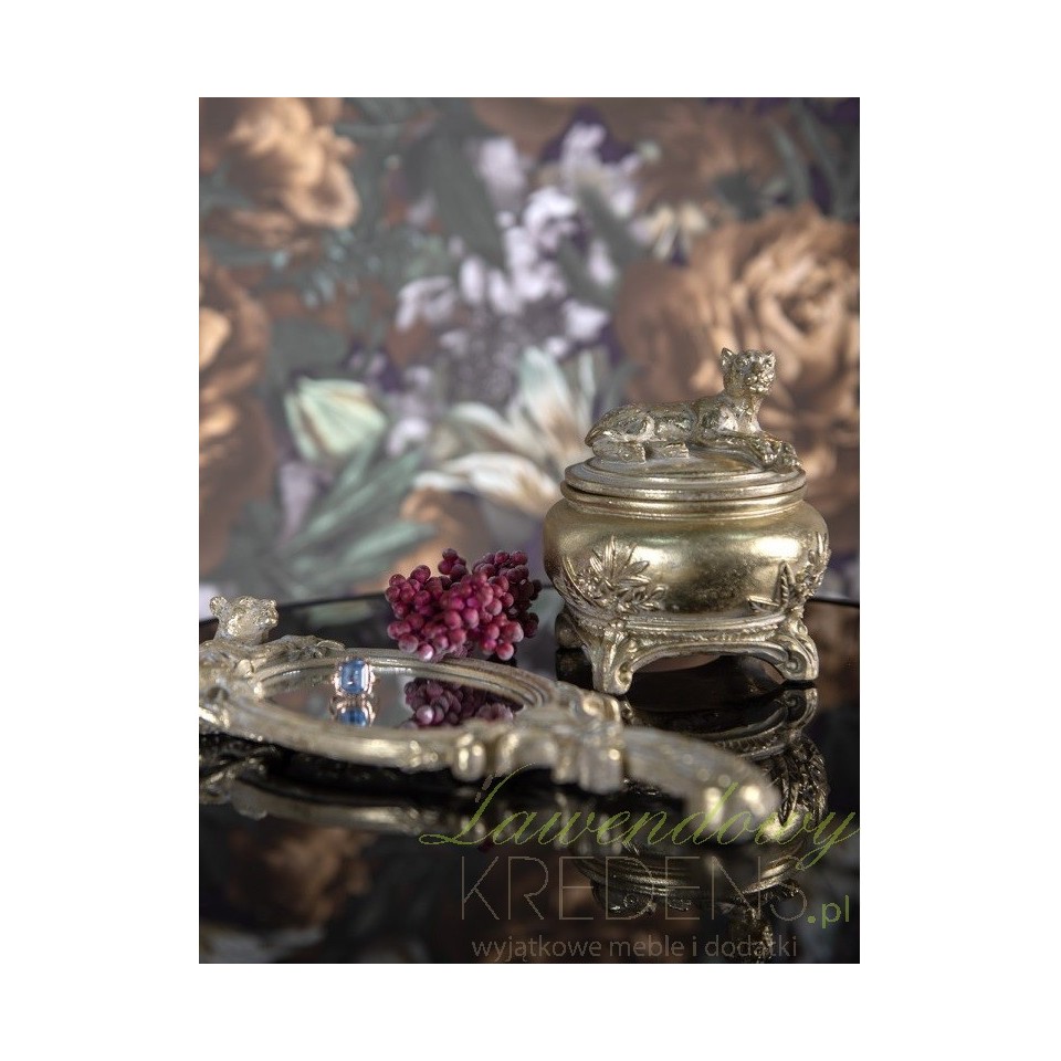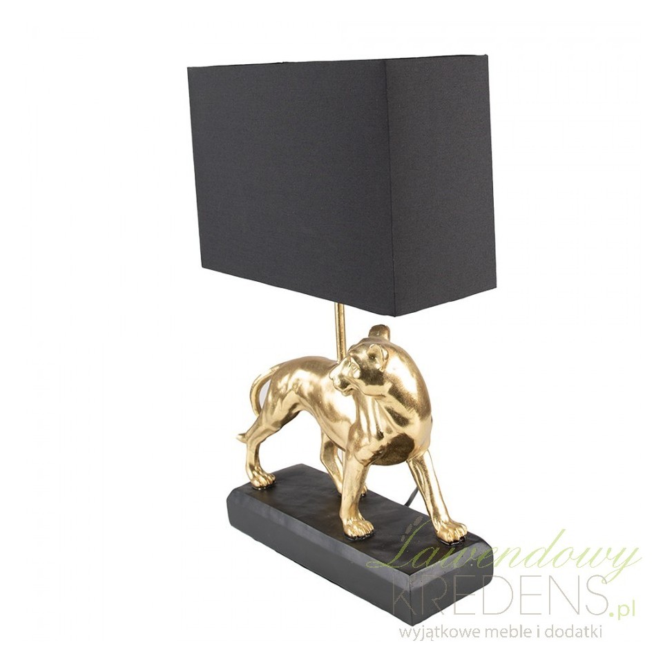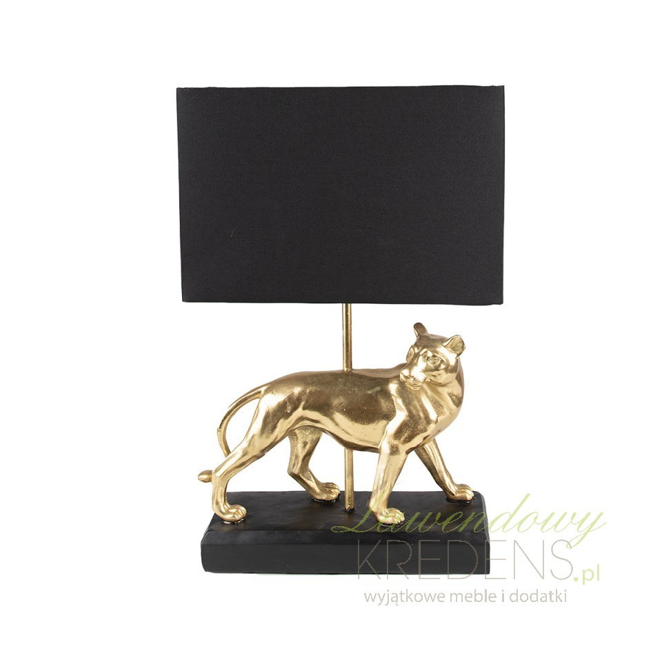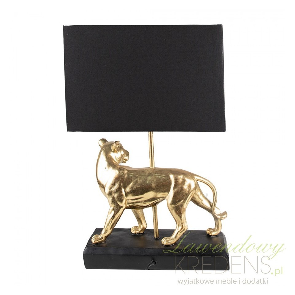 Lampa stołowa Leopard Clayre & Eef pięknie łączy złotą figurkę dekoracyjną z czarną podstawą i kloszem w matowym wykończeniu.
