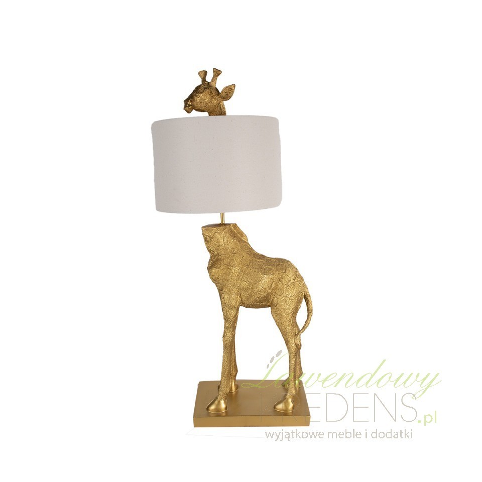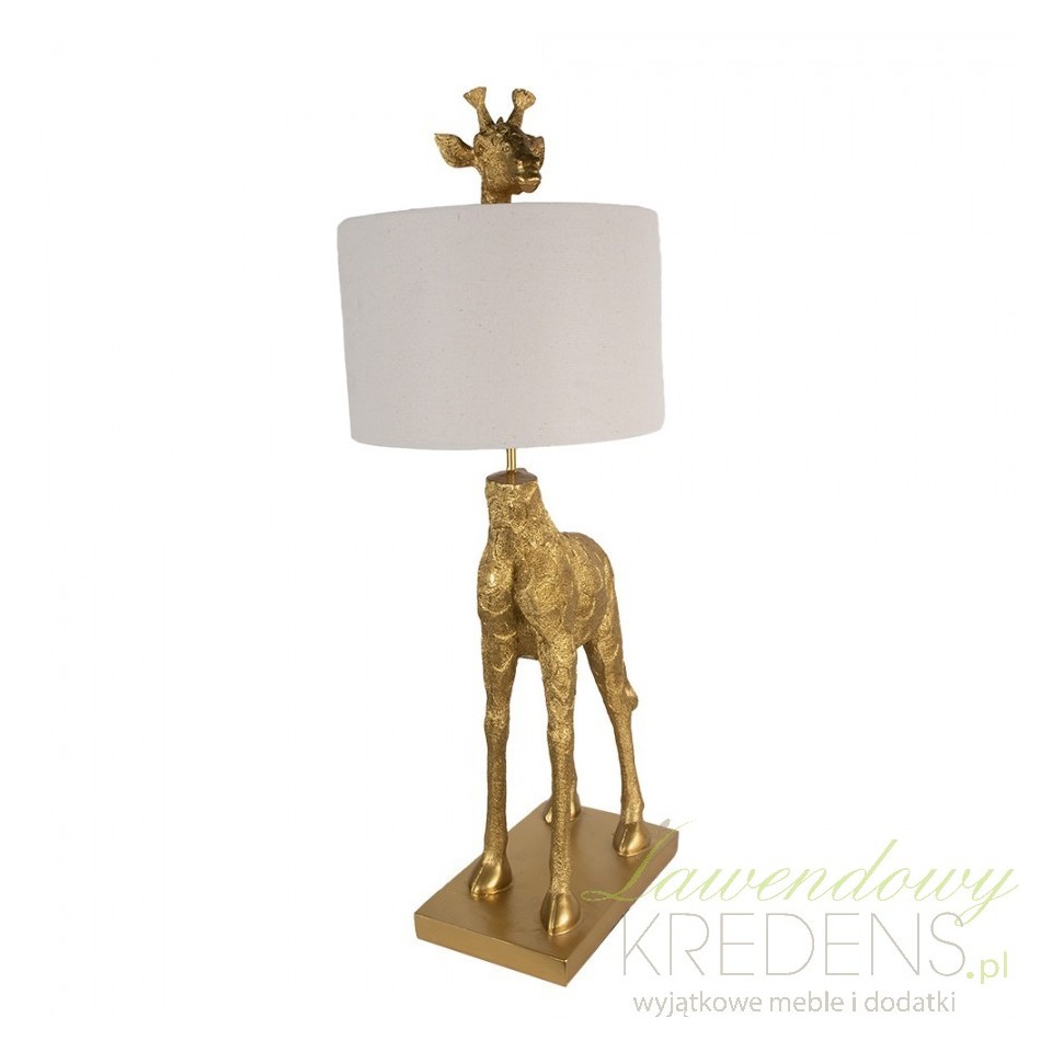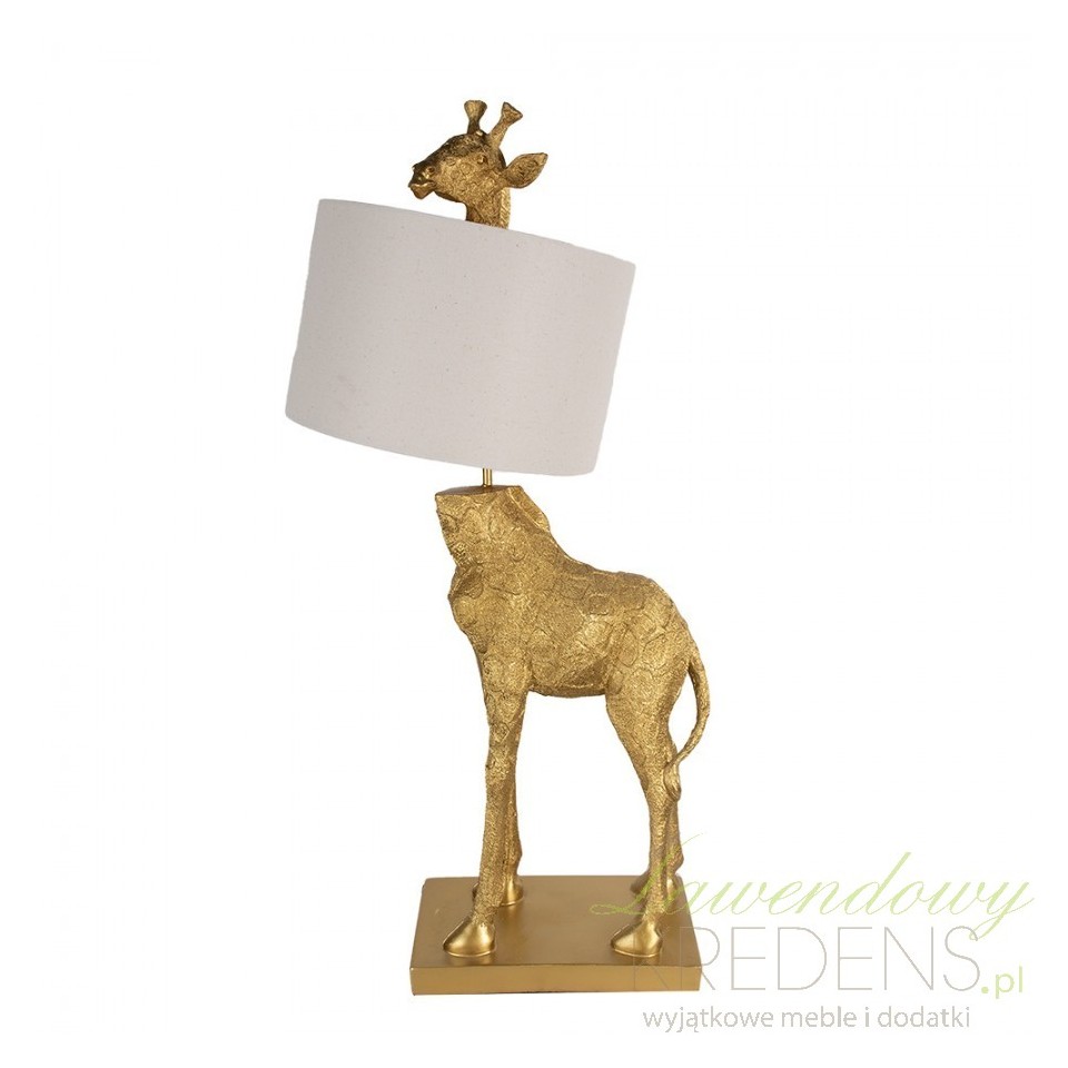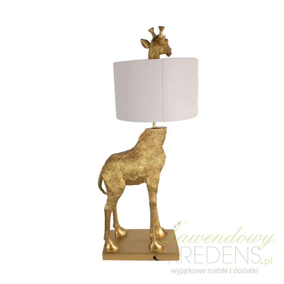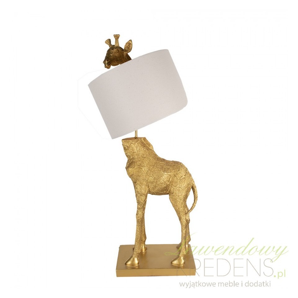 Podstawa lampy w kształcie figurki żyrafy stanowi spektakularnie wyróżniający się element. Wykonana z wysokiej jakości materiałów, i pokryta złotym kolorem, dodaje lampie prestiżu i luksusowego wyglądu. Głowa żyrafy wystaje ponad klosz, tworząc dynamiczny efekt i zatrzymując uwagę wszystkich, którzy na nią spojrzą. Klosz lampy, o okrągłym kształcie i białym kolorze, daje miękkie, rozproszone światło, które tworzy przyjemną atmosferę w pomieszczeniu. Jego minimalistyczny wygląd doskonale kontrastuje z intrygującą podstawą, podkreślając wyjątkowość oświetlenia. Nasza duża lampa stołowa to nie tylko źródło światła, ale również wyjątkowa dekoracja, która przyciąga wzrok i dodaje wnętrzu wyjątkowego charakteru. Niezależnie od tego, czy umieścisz ją w salonie, sypialni czy biurze, ta lampa stanie się niezastąpionym elementem aranżacji, który ożywi i podkreśli wyjątkowość wnętrza. Wybierz duże lampy stołowe, aby dodać swojemu domowi niepowtarzalnego uroku, stylu i elegancji. Będzie to zarówno praktyczne źródło światła, jak i artystyczna ozdoba, która przyciągnie spojrzenia i stworzy niezapomnianą atmosferę w Twojej przestrzeni.