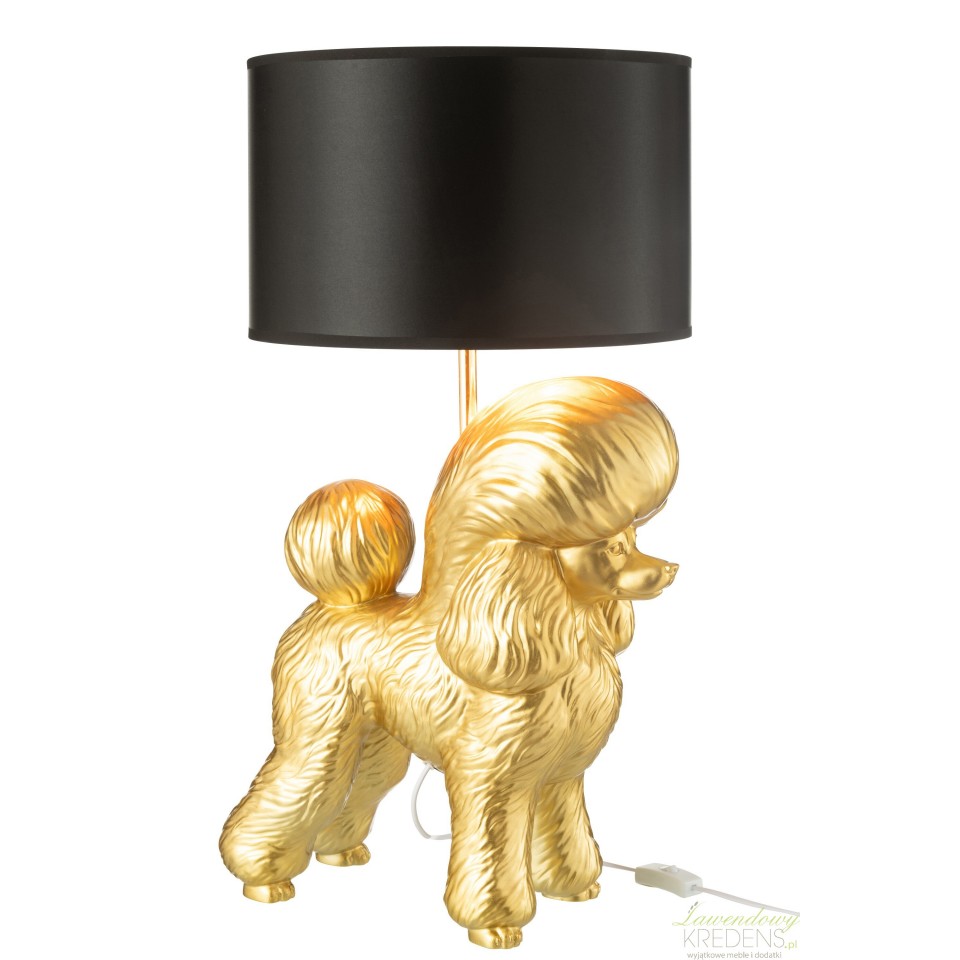 Podstawa w kształcie złotego pudla to nie tylko funkcjonalny element, ale także wyrazisty akcent, który wnosi do wnętrza elegancję i odrobinę humoru. Połączenie bogatego złotego odcienia z klasycznym czarnym kloszem z tkaniny sprawia, że lampa ta jest zarówno stylowa, jak i uniwersalna, idealnie pasująca do wnętrz urządzonych w stylu glamour, art deco czy eklektycznym.
