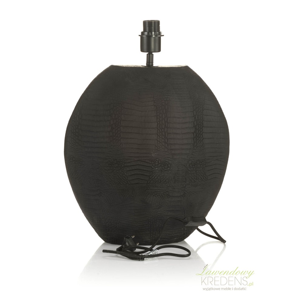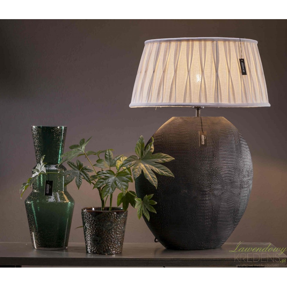 Szukasz lampy stołowej do salonu lub sypialni, która daje przytulne światło, ale jednocześnie wygląda jak przemyślana dekoracja? Aluro Lenox L rozwiązuje typowy problem „ładna, lecz nijaka” – tu pierwsze skrzypce gra głęboka czerń i wyrazista tekstura przypominająca skórę tłoczoną w motyw krokodyla. Dzięki temu lampa nie ginie na tle sof, komód ani czarnych dodatków; buduje kontrast z jasnym drewnem i podkreśla szlachetność kamienia, betonu architektonicznego czy złamanej bieli. Jako projektant wnętrz polecam ją tam, gdzie chcesz wprowadzić akcent „premium” bez przeładowania aranżacji.Lampa stołowa z fakturą krokodyla do salonu i sypialni