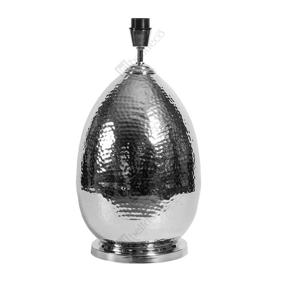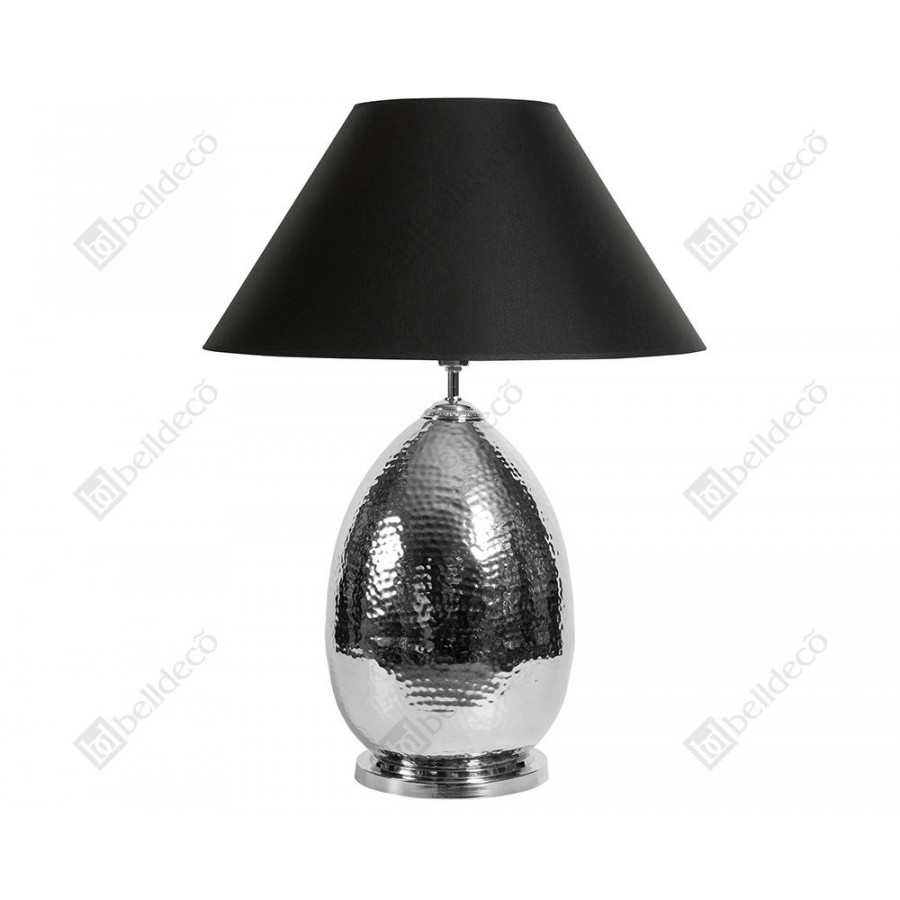 Lampa Deluxe firmy Belldeco wykonana jest z aluminium w kolorze srebrnym. Jest szeroka i stoi na okrągłej podstawie. Ma nierówną fakturę, co daje jej charakterystyczny wygląd.
