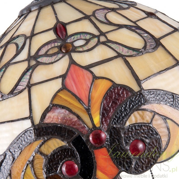Lampy Tiffany wykonane są z wysokiej jakości szkła i polirezynu. Lampy witrażowe zbudowane są z wielu różnej wielkości kawałków szkła, bardzo kolorowych i stanowiących jedną całość. Lampa Tiffany ma duży rozmiar i stoi na solidnej nodze. Zdobi ja unikalny i wyjątkowy wzór.