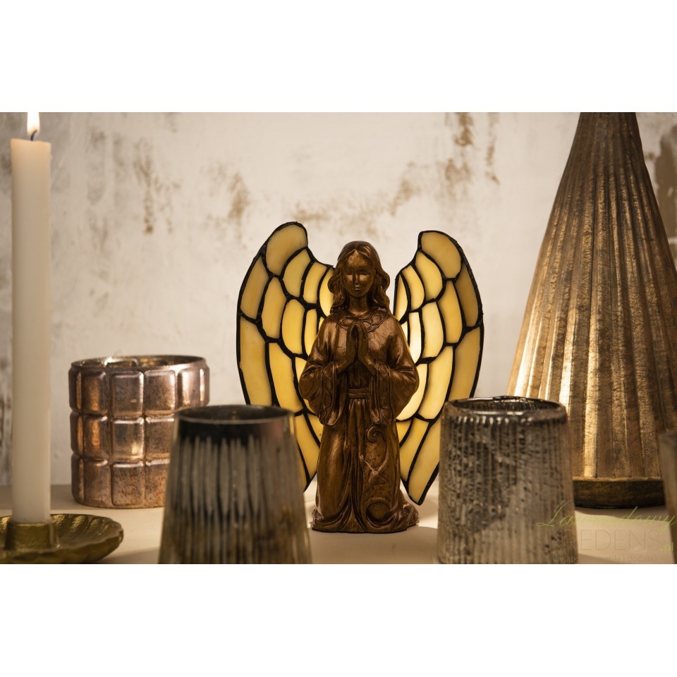 Mała, stołowa lampa Tiffany to Anioł z szklanymi skrzydłami, które są elementem oświetlajacym sypialnianą lub pokojową przestrzeń.