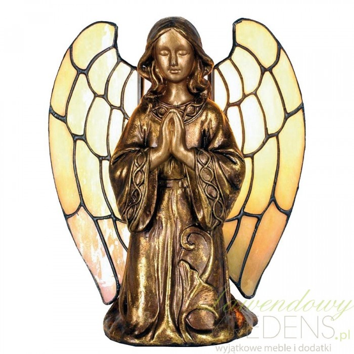 Lampa Tiffany w kształcie Anioła wykonana została w ciepłych kolorach. Skrzydła Anioła wykonano z połączonych ze sobą małych szkiełek. Trzon lampy to kleczący Aniołek ze złozonymi dłońmi w pozłacanym kolorze. Gwarancja niezwykle klimatycznej aranżacji w sypialni lub salonie za sprawą wyjątkowej lampy witrażowej w stylu prowansalskim.
