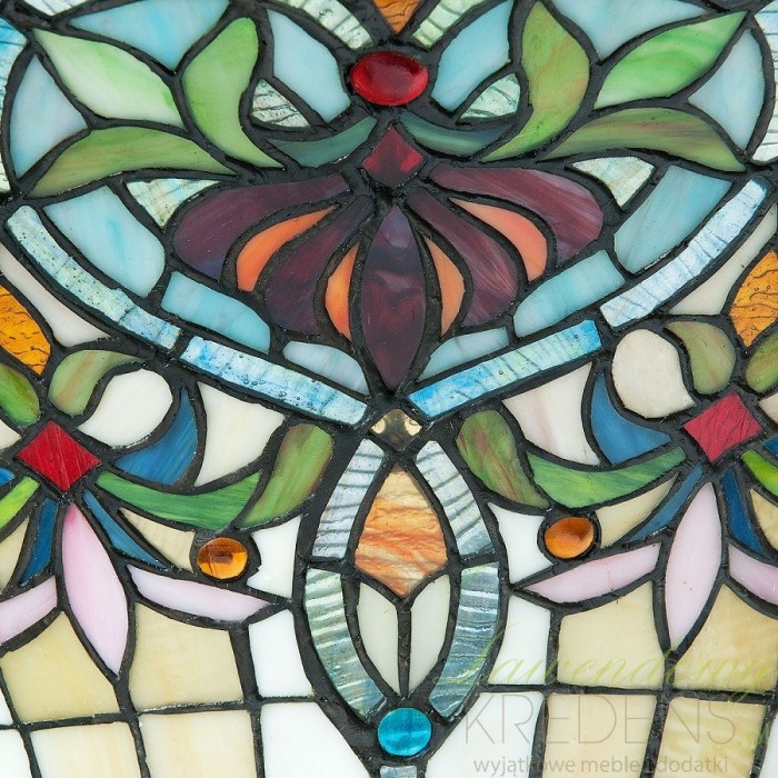 Lampa Tiffany wykonana jest z wysokiej jakości szkła i metalu. Można ją podwiesić do sufitu za pomocą sześciu łańcuchów. Posiada przepiękny, niepowtarzalny i kolorowy wzór. Lampy witrażowe i lampy Tiffany to cudowny nabytek, który posłuży Ci na długie lata.