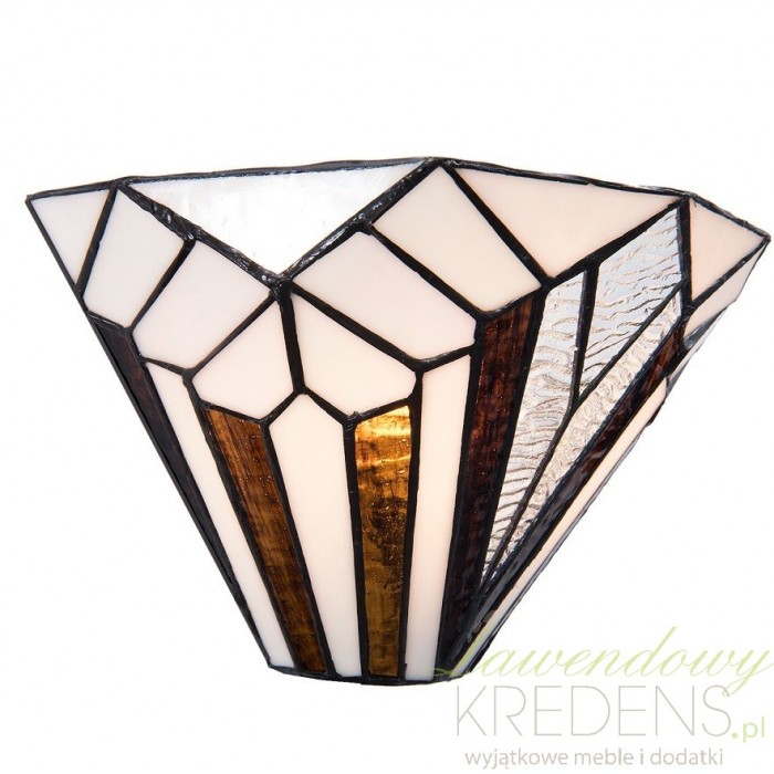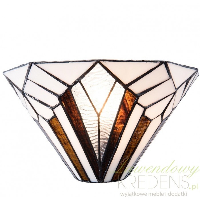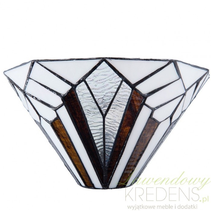 Zachwyci Cię już na pierwszy rzut oka swoim wyjątkowym designem. Klosz, wykonany z wielu szklanych, małych elementów, ukazuje biało-brązowe wzory w kształcie figur geometrycznych, które tworzą harmonijną kompozycję o subtelnym i jednocześnie efektownym wyglądzie. Co więcej, każdy detal został ułożony ręcznie, co sprawia, że nasz kinkiet Tiffany jest niepowtarzalny i wyjątkowy w swoim rodzaju.