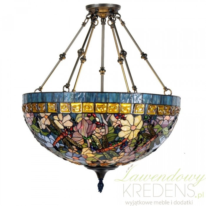 Prosty kształt klosza w wielu kolorach został wykonany w całości ze szkła i metalu. Klosz utrzymuje siedem metalowych prętów ze zdobieniem, schodzących się ze sobą przy podsufitce. Lampy Tiffany w stylu prowansalskim dzięki kwiatom jakie zdobią ich klosze będą jednymi z najpiękniejszych lamp w Twoim domu. Lampy witrażowe takie jak lampa Tiffany to energetyzujacy, a zarazem wyniosły sposób na oświetlenie.