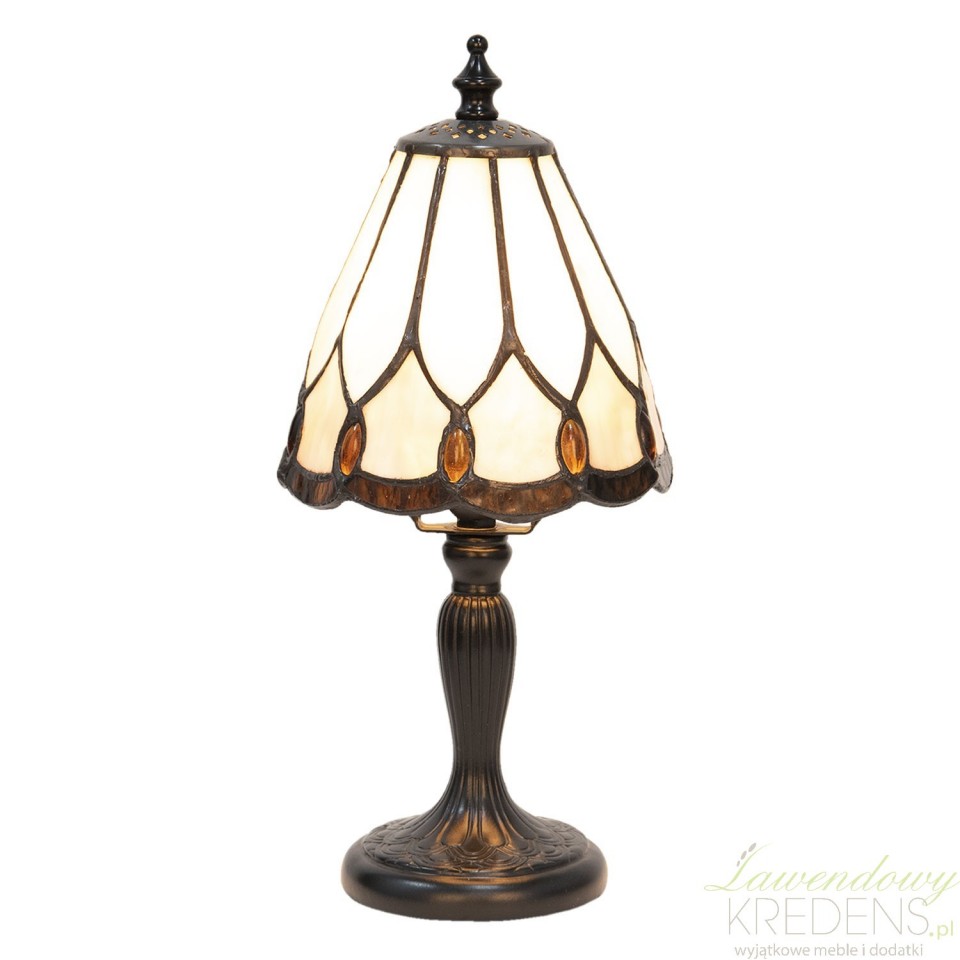 Podstawa lampy, utrzymana w brązowym odcieniu, to niczym rzeźbiony piedestał, który nosi witrażowe dzieło sztuki. Liczne rzeźbienia na podstawie są niczym misterny detal, który dodaje lampie głębi i charakteru. Brązowy kolor harmonizuje z odcieniami klosza, tworząc niezwykłe połączenie tradycji i nowoczesności.