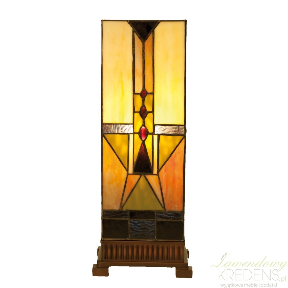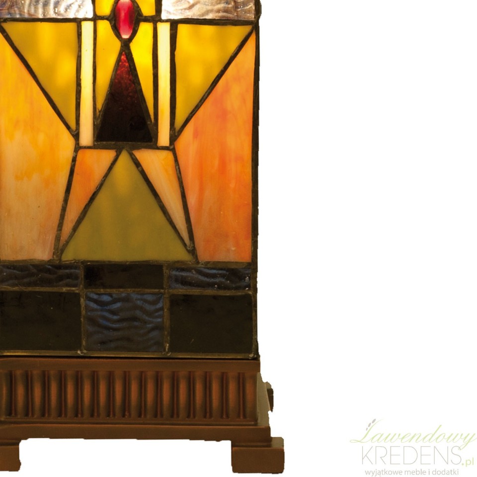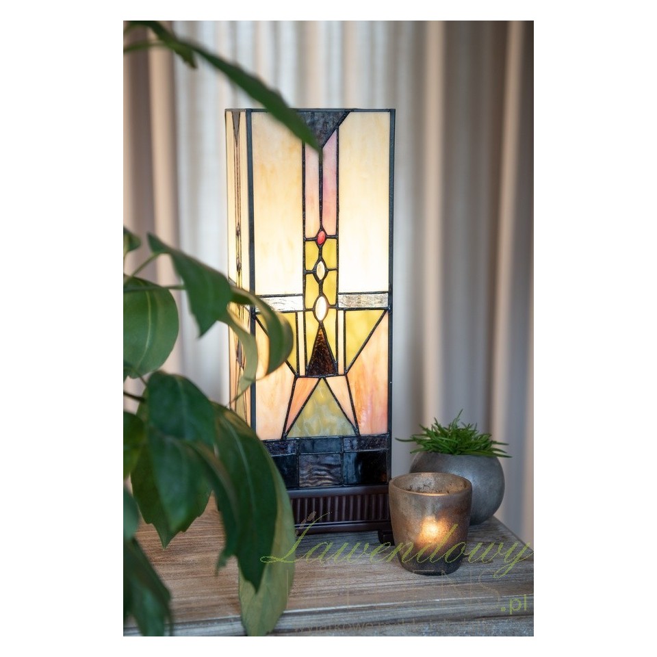 Lampa stołowa Tiffany kolumna od Clayre & Eef to misterne połączenie sztuki, kunsztu rękodzielniczego i funkcjonalności, gdzie klosz w kształcie prostopadłościanu jest niczym witrażowy świat pełen abstrakcyjnych form geometrycznych.