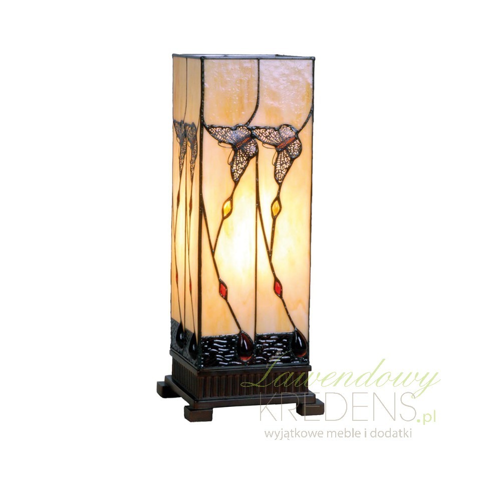 Witrażowa lampa stołowa Tiffany ma klosz, utrzymany w kształcie prostopadłościanu,. To prawdziwe pole doświadczeń artystycznych, ozdobione kolorowymi elementami, w tym motylami i innymi misternie wykonanymi wzorami witrażowymi, w ciepłych i jasnych barwach.