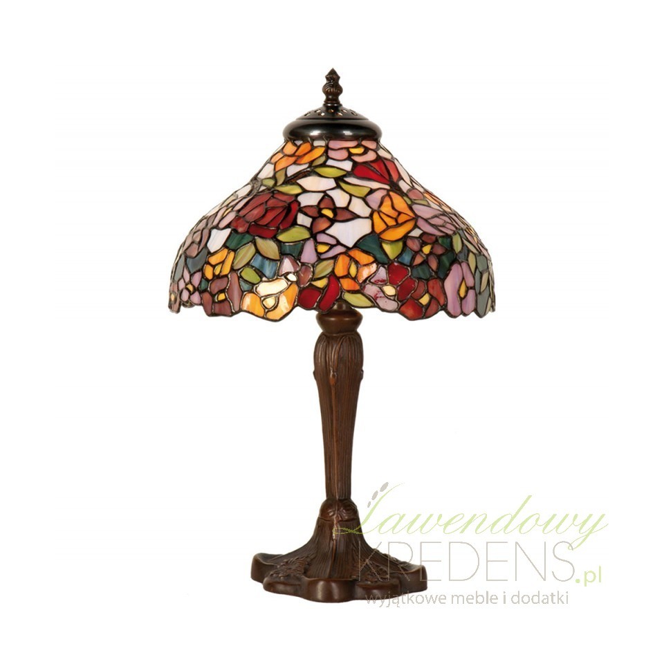 Lampa Tiffany ze szklanym kloszem oraz ciemna podstawą, niby klasyczna a jednak wyróżniająca się. Wyjątkowy klosz w postaci witrażu, wypełniony został kolorymi kwiatami co dodaje jej świeżości.