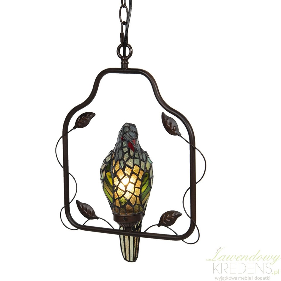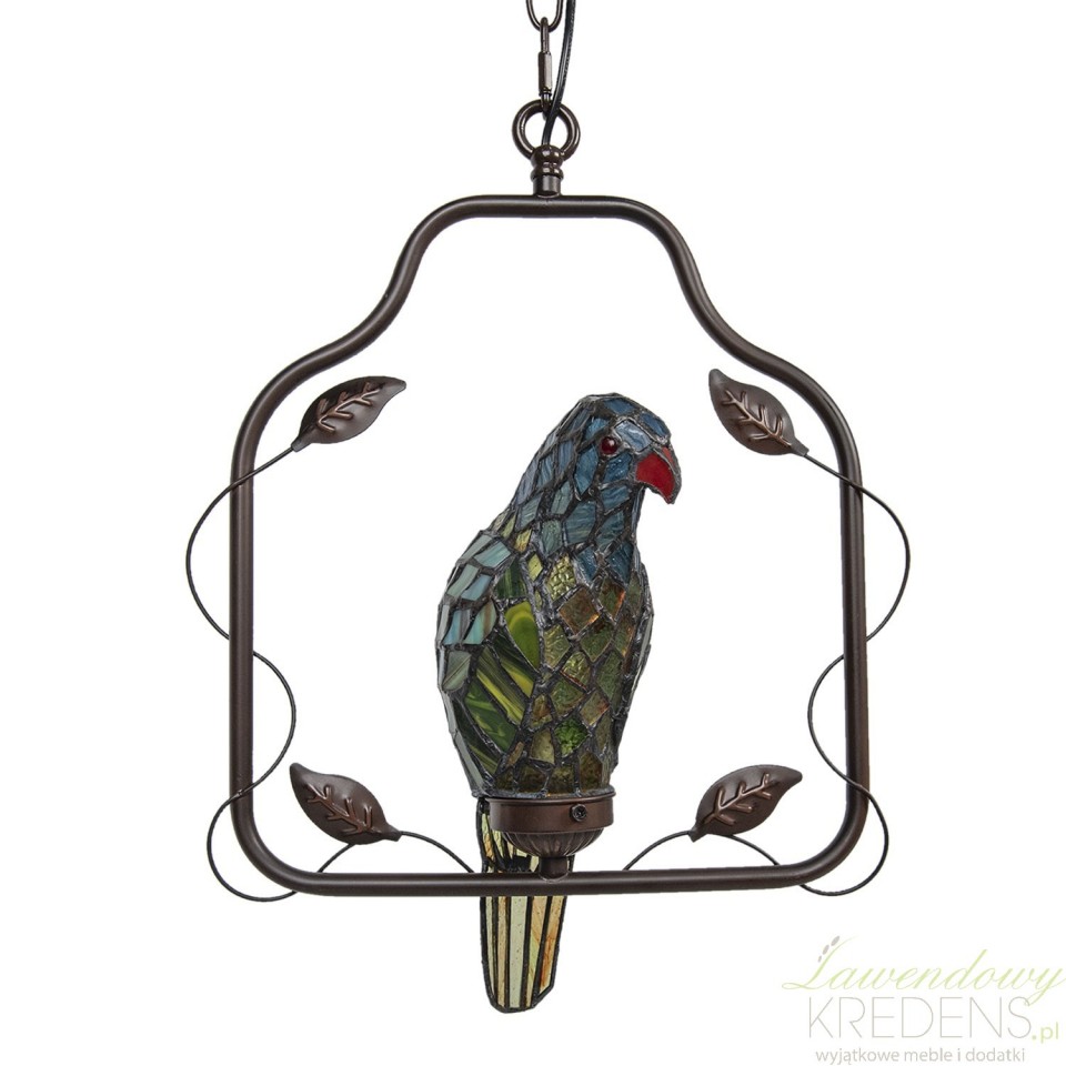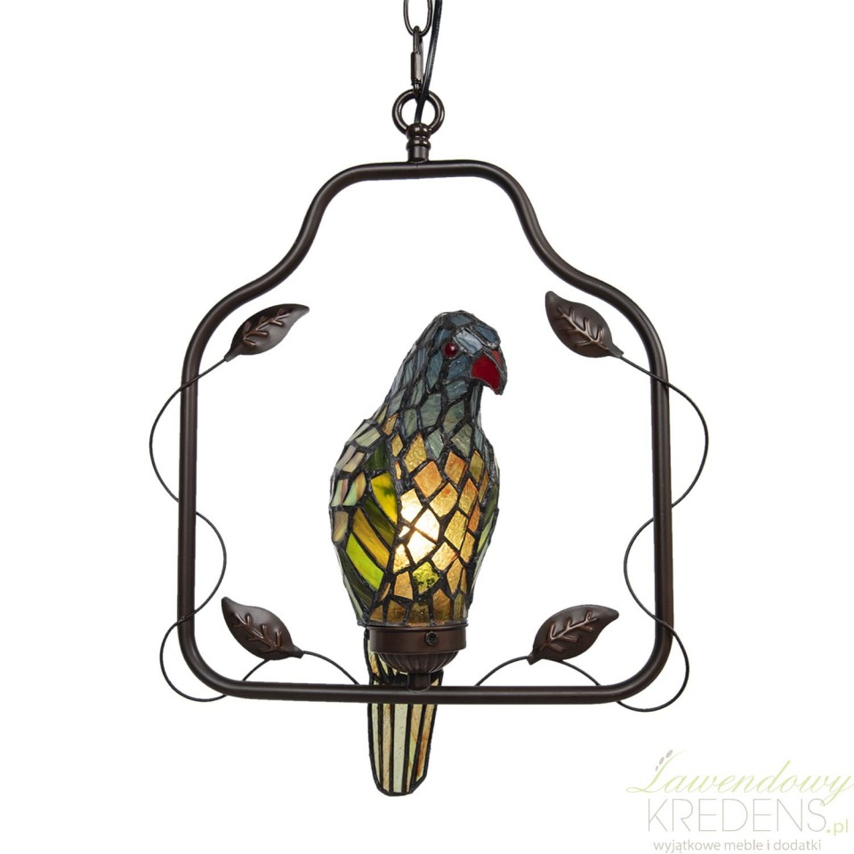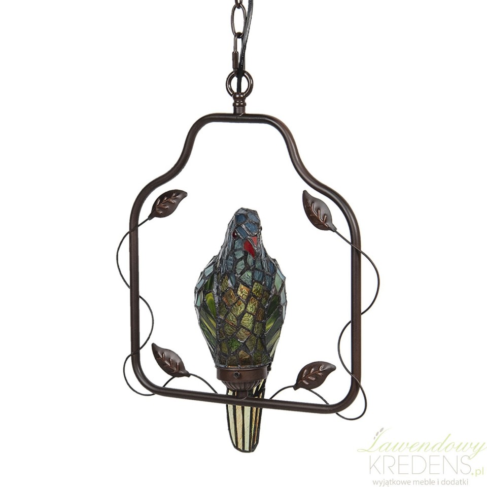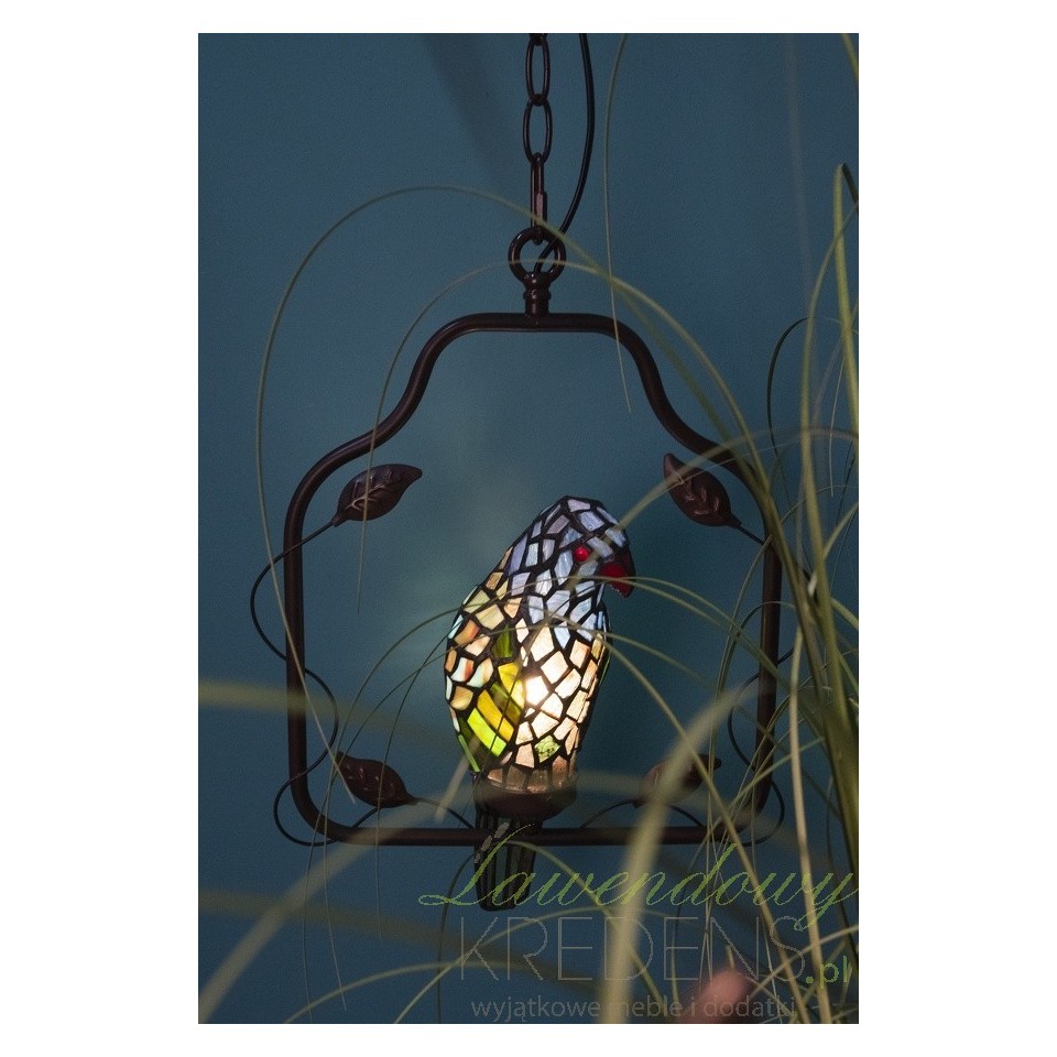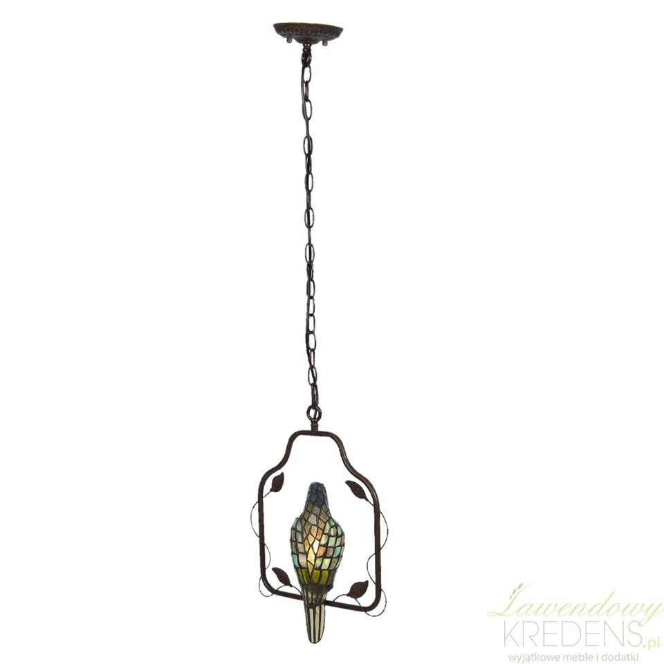 Lampa sufitowa z ptaszkiem zbudowana jest z metalu i kolorowego szkła. Ptaszek jest głównym elementem dekoracyjnym prezentowanej lampy i osadzony jest w prostokątnej ramie, do której przymocowano łańcuch. Uwolnij swoją wyobraźnię i zamów lampy witrażowe. Lampa Tiffany doda wnętrzu kolorów i prowansalskiego charakteru.