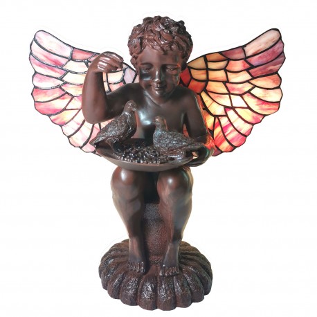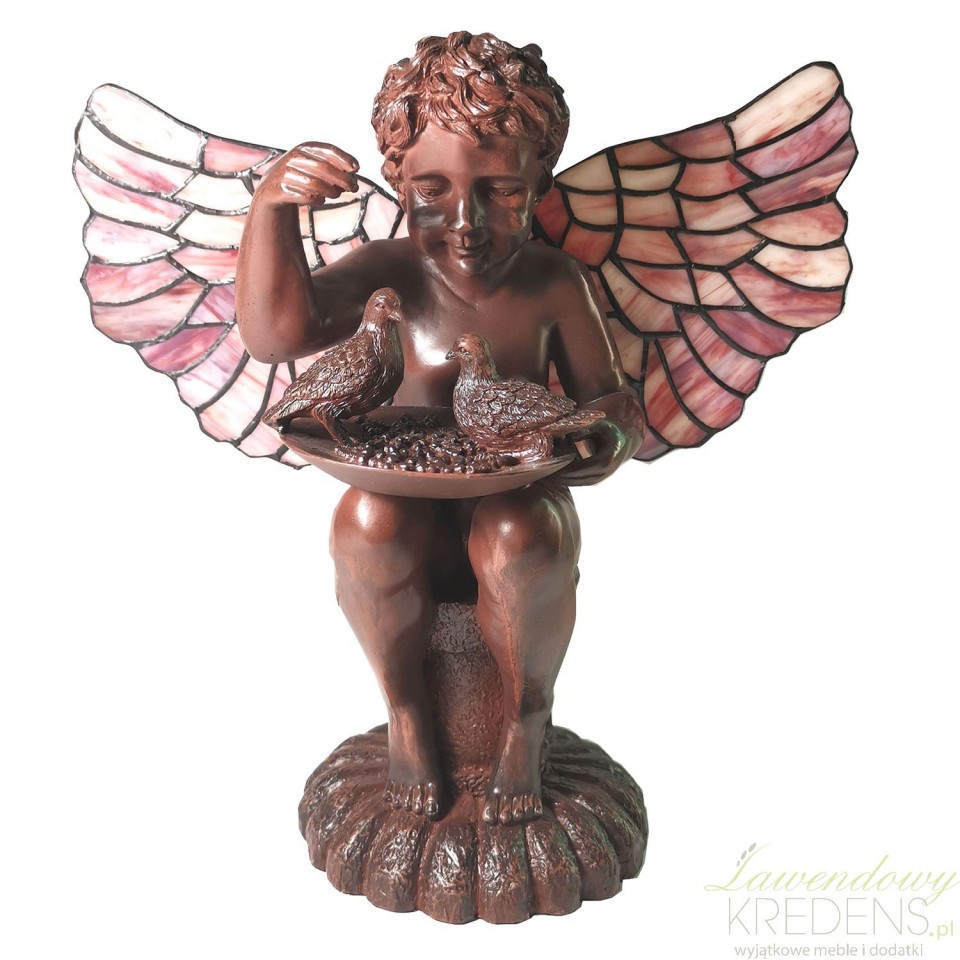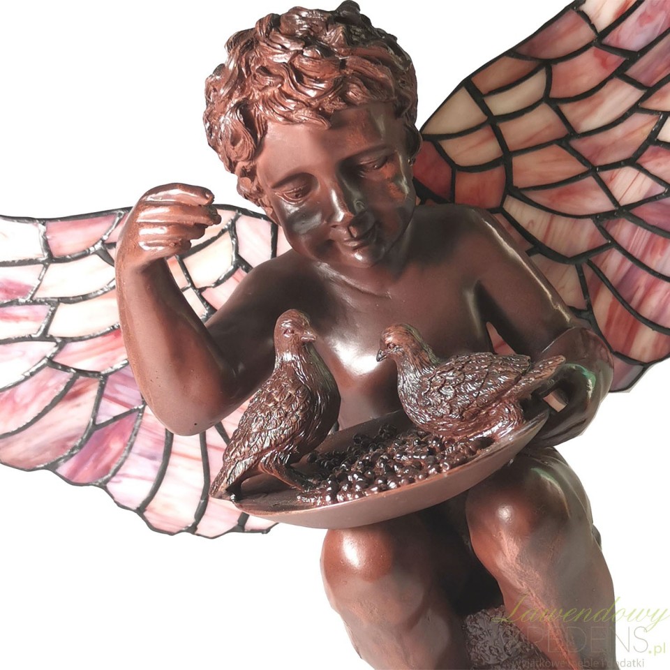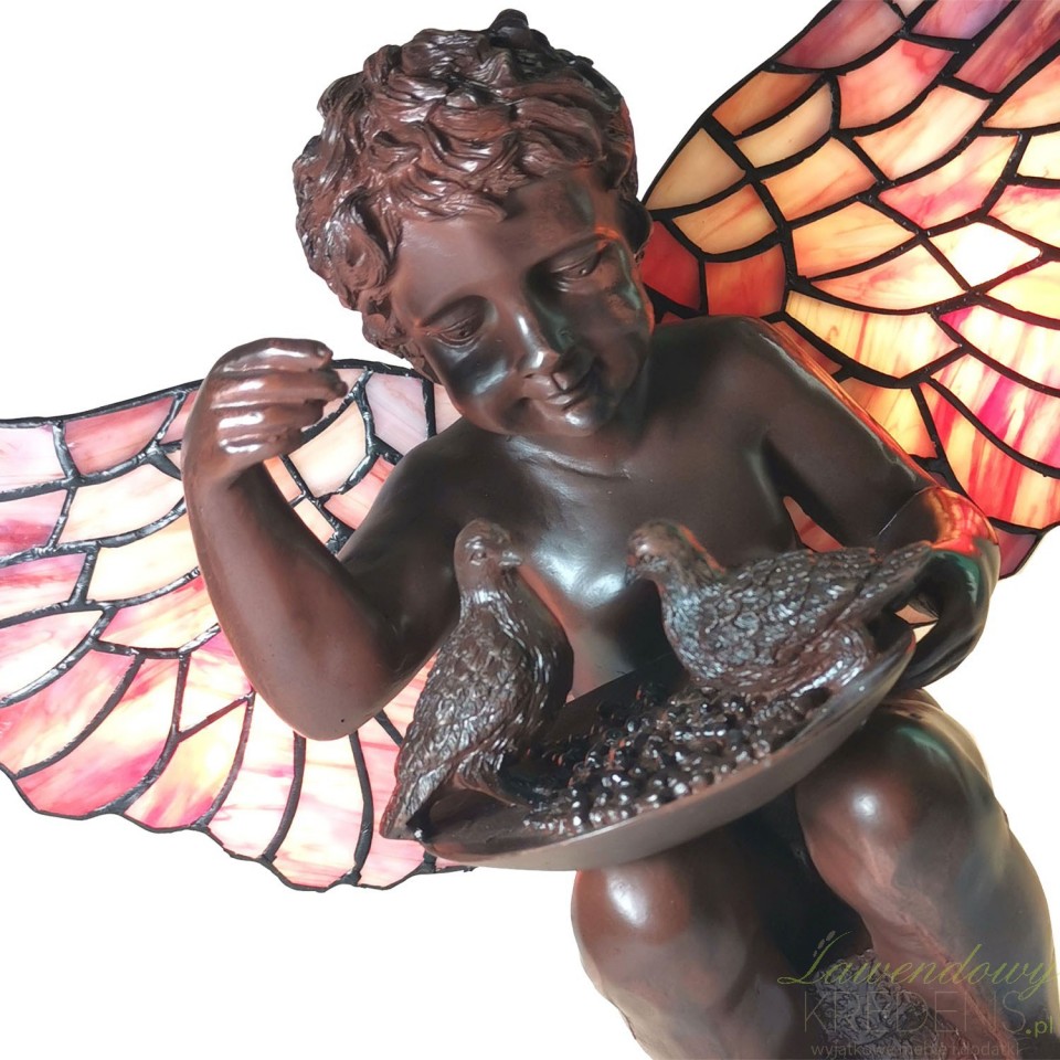 Lampa Tiffany w kształcie aniołka z kolorowymi skrzydłami z opalizującego szkła nie jest zwykłą lampką. Jej zadaniem jest subtelnie dekorować wybraną przestrzeń i delikatnie ją oświetlać. To fantastyczny sposób na uzupełnienie aranżacji sypialni, w której z pewnością docenisz romantyczny nastrój jaki stworzy ta lampa. Lampy witrażowe kojarzone z witrażami okiennymi spotykanymi w świątyniach to współcześnie atrakcyjne dodatki do wnętrz.