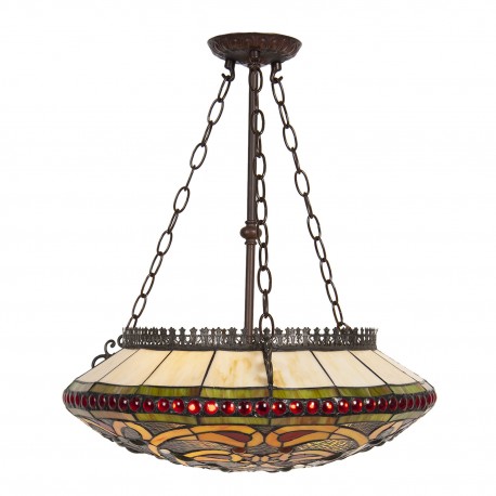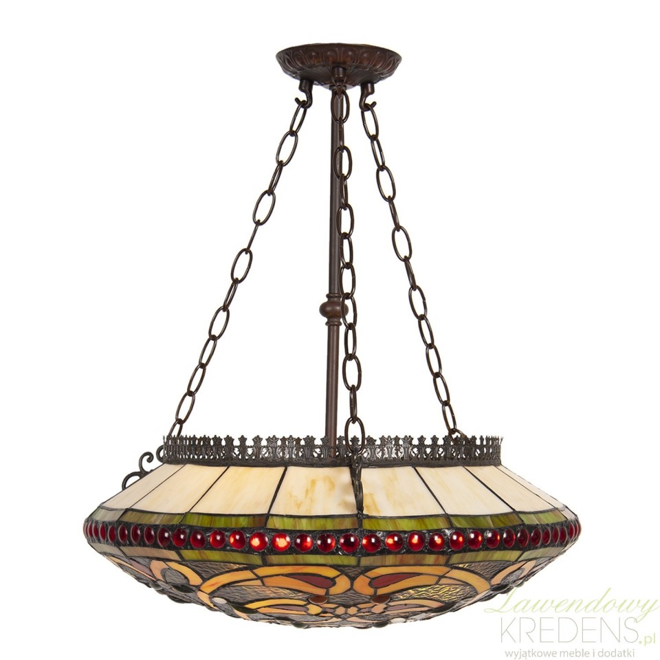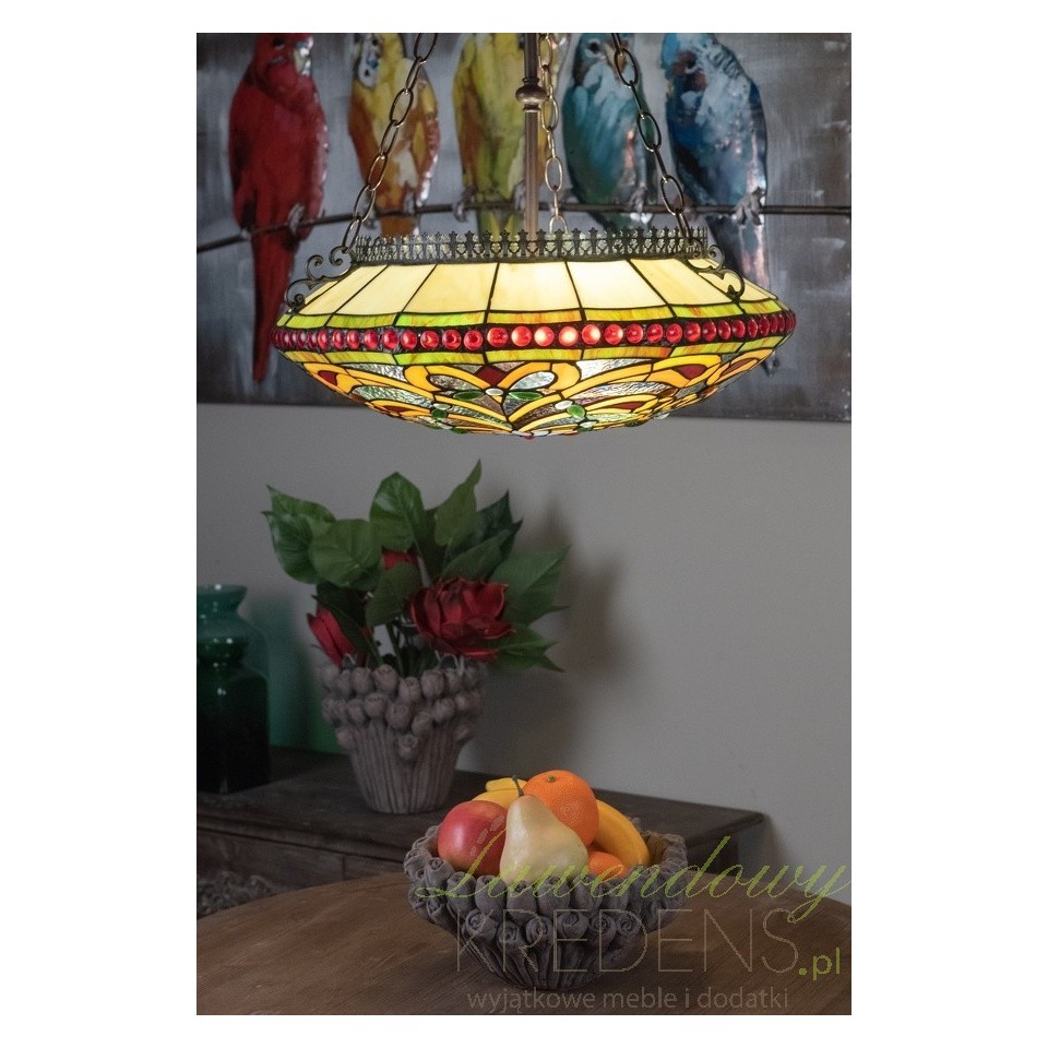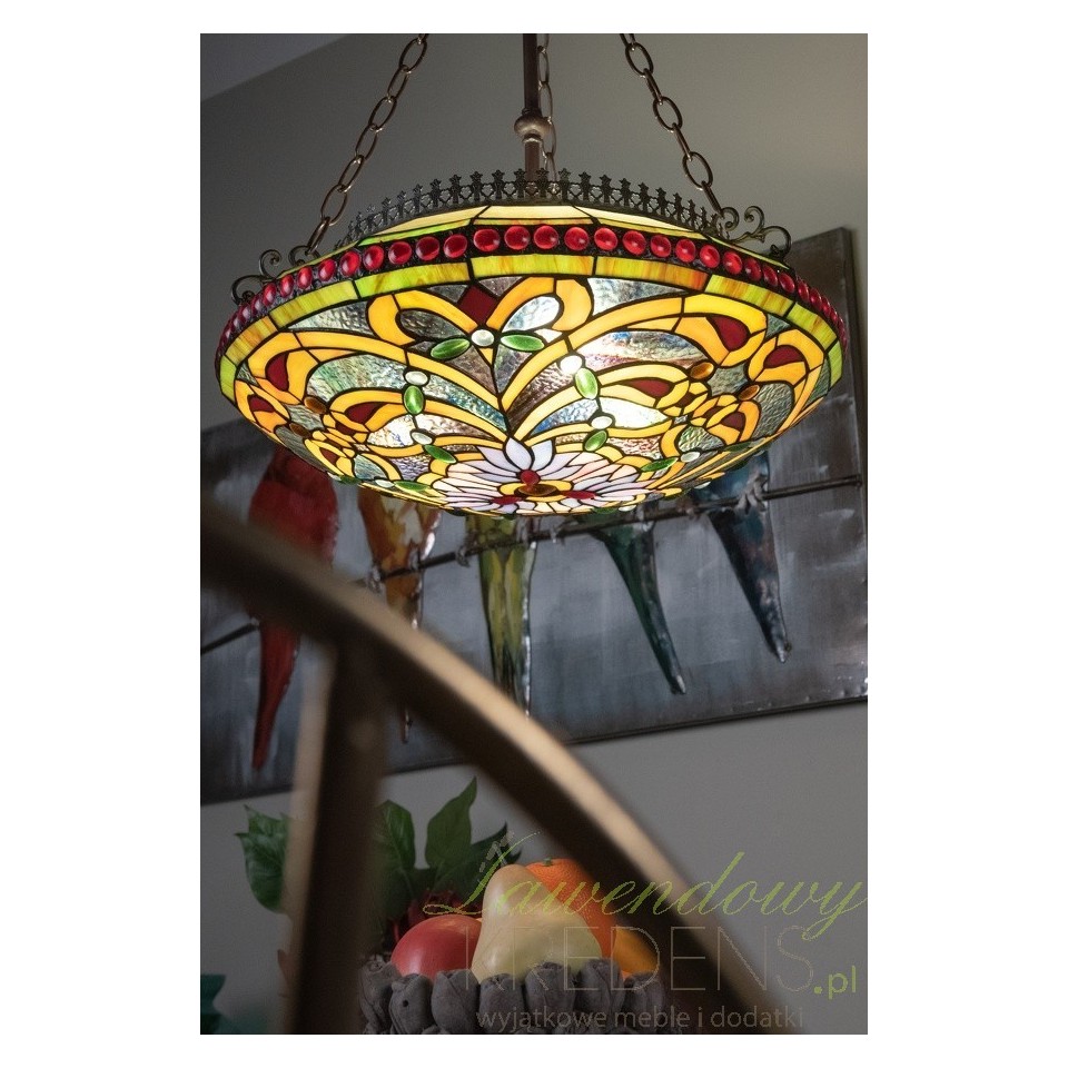 Potężny żyrandol Tiffany zawieszony na metalowych łańcuchach zasługuje na to aby zamocować go w centrum uwagi - w salonie lub w jadalni nad stołem.