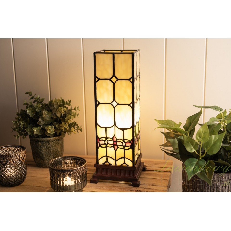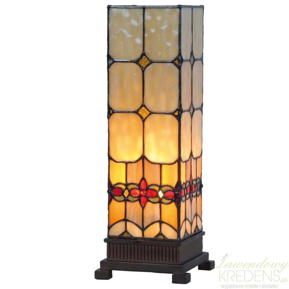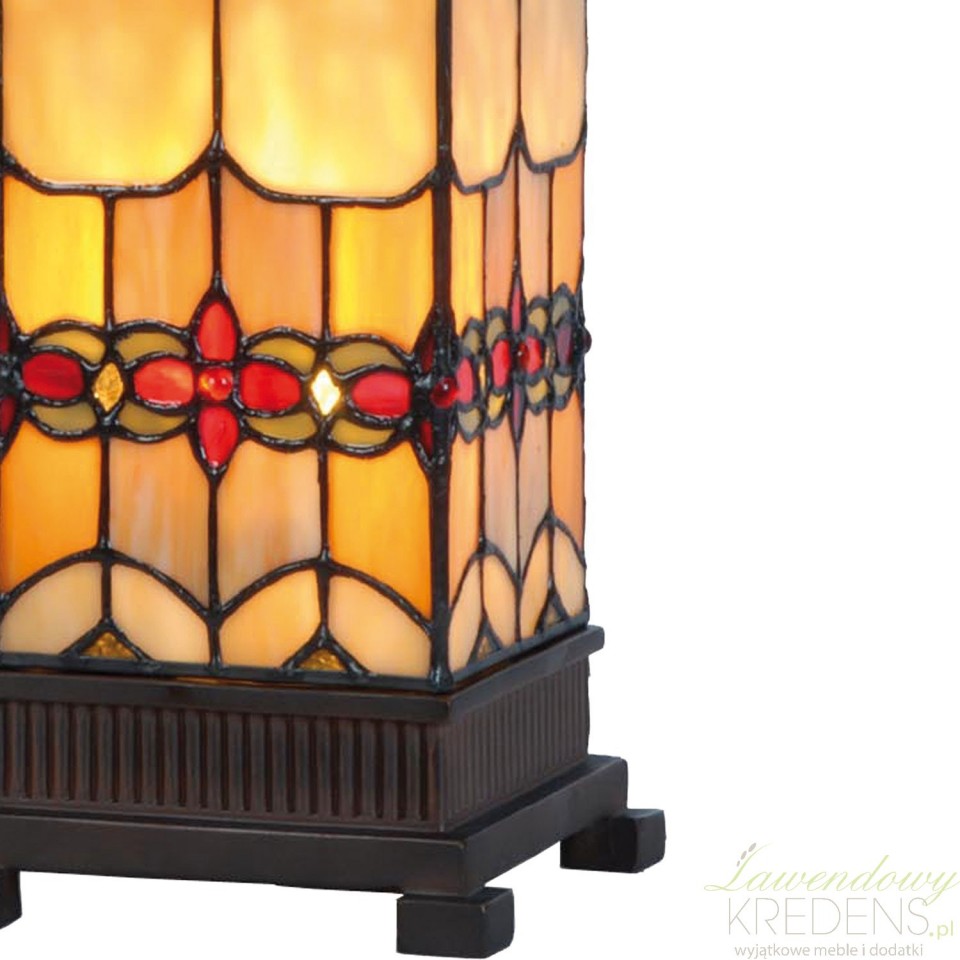 Stojąca lampa Tiffany prosta Clayre & Eef w kształcie prostopadłościanu to niczym kamień szlachetny w świecie oświetlenia, gdzie szklany klosz z geometrycznymi wzorami w ciepłych kolorach jest centralnym punktem tej eleganckiej kompozycji.