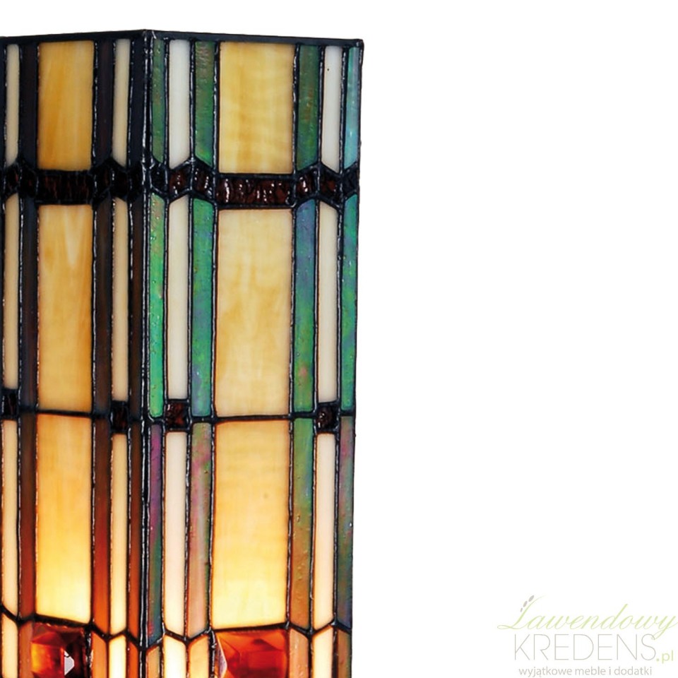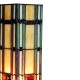 Lampa stojąca Tiffany prosta ma klosz ozdobiony kolorowymi elementami w postaci różnokształtnych prostokątów, tworzących harmonijną mozaikę o intensywnych barwach, od soczystej zieleni po głęboką czerwień.