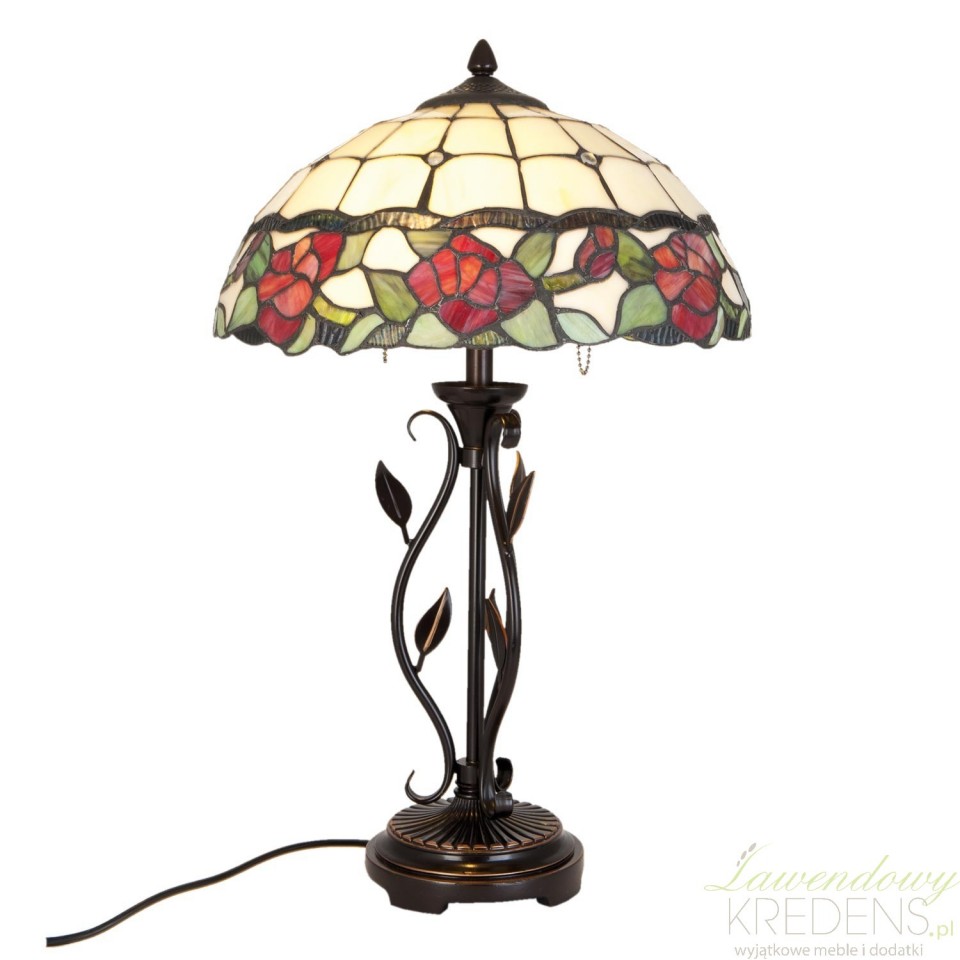 Ta duża lampa stołowa Tiffany ma szklany klosz z motywem czerwonych róż, na szczycie ciemnobrązowej podstawy z ozdobnymi listkami.