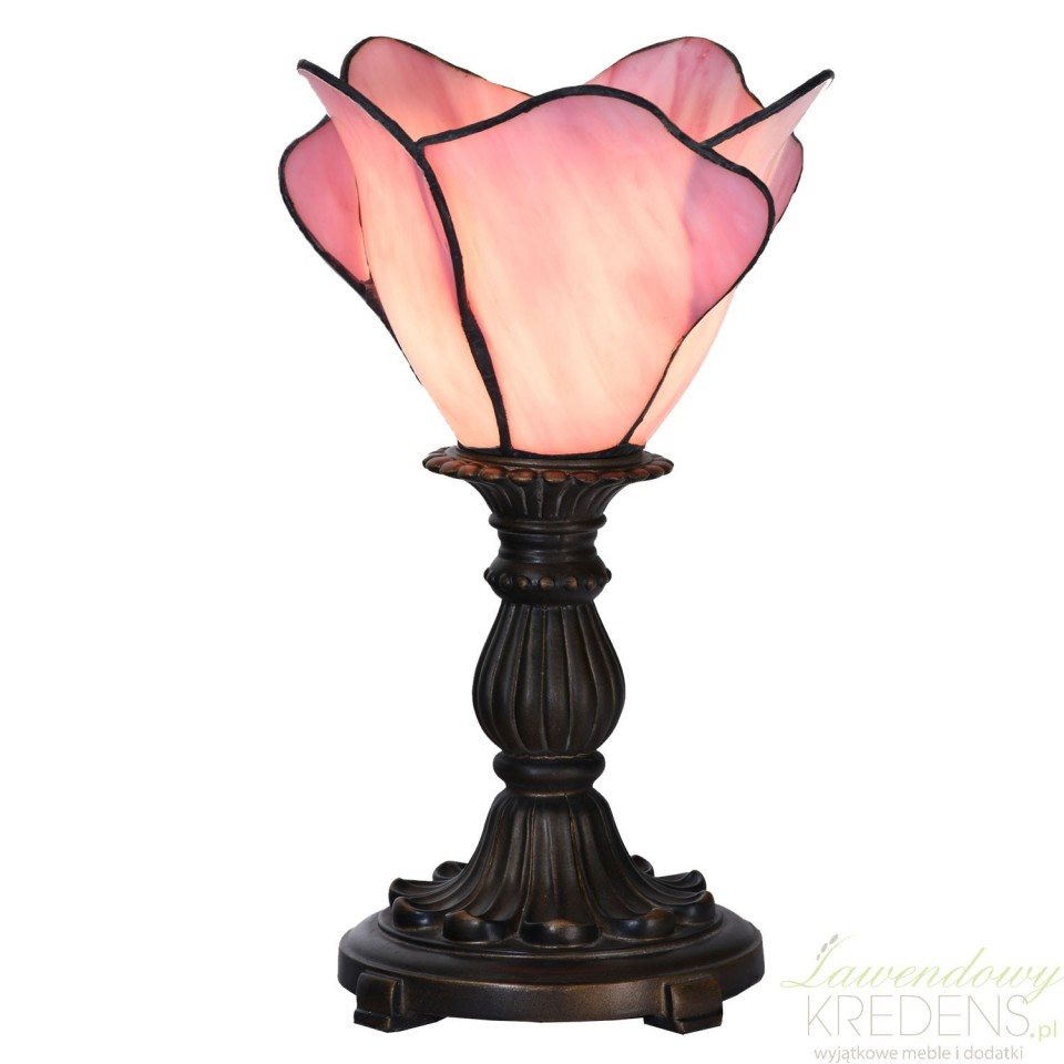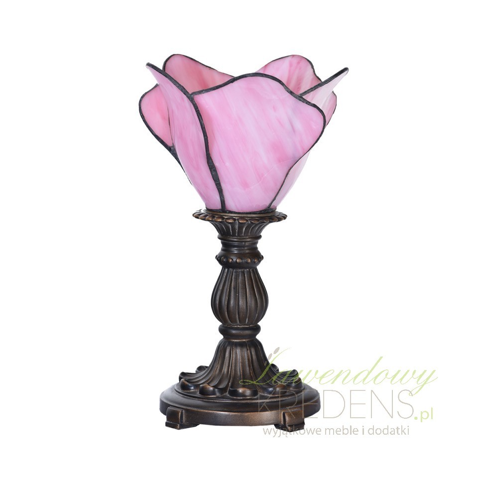 Lampa Tiffany przypominająca rozkwitający kwiat to ozdoba każdej szafki nocnej czy też stolika. Posiada ona szklany klosz w różowym odcieniu o kształcie płatków.