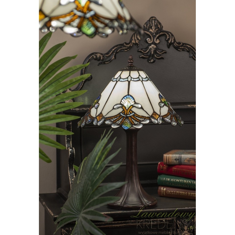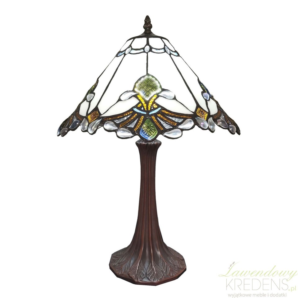 Posiadająca kolorowy klosz, stołowa lampa stojąca Tiffany Clayre & Eef o artystycznym wyglądzie pasuje na stolik nocny i na biurko.