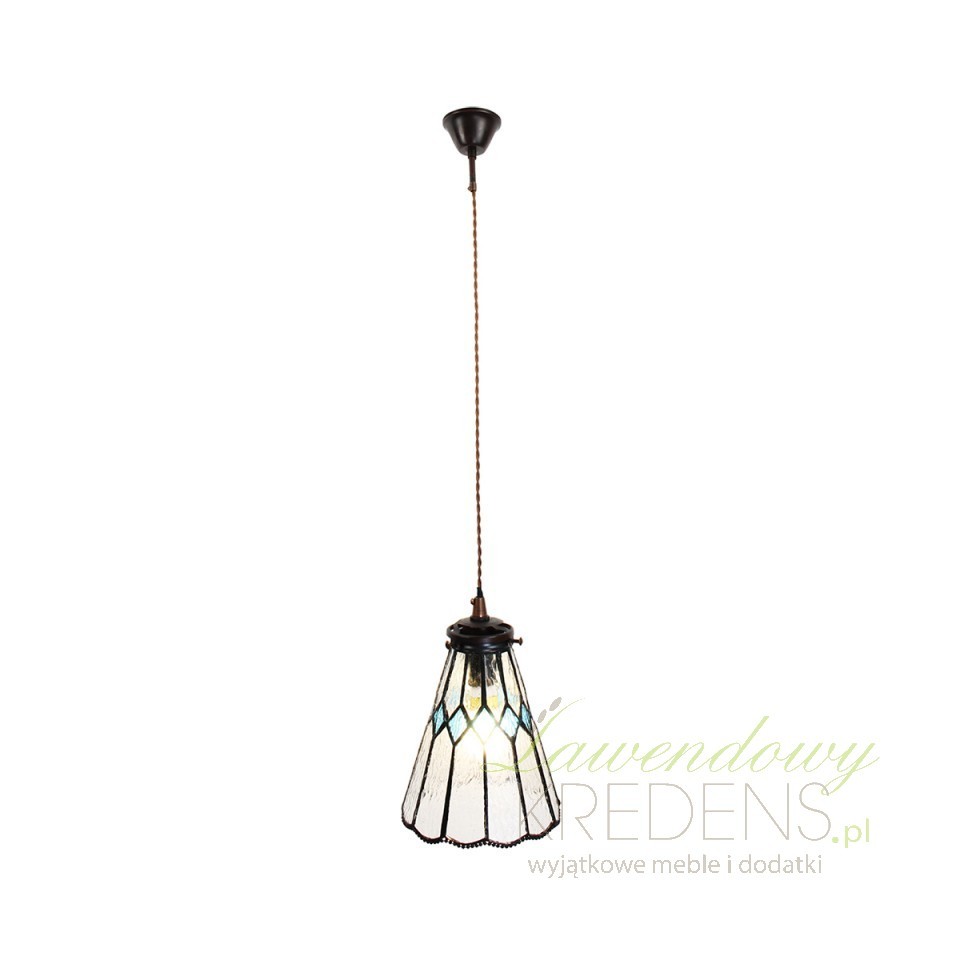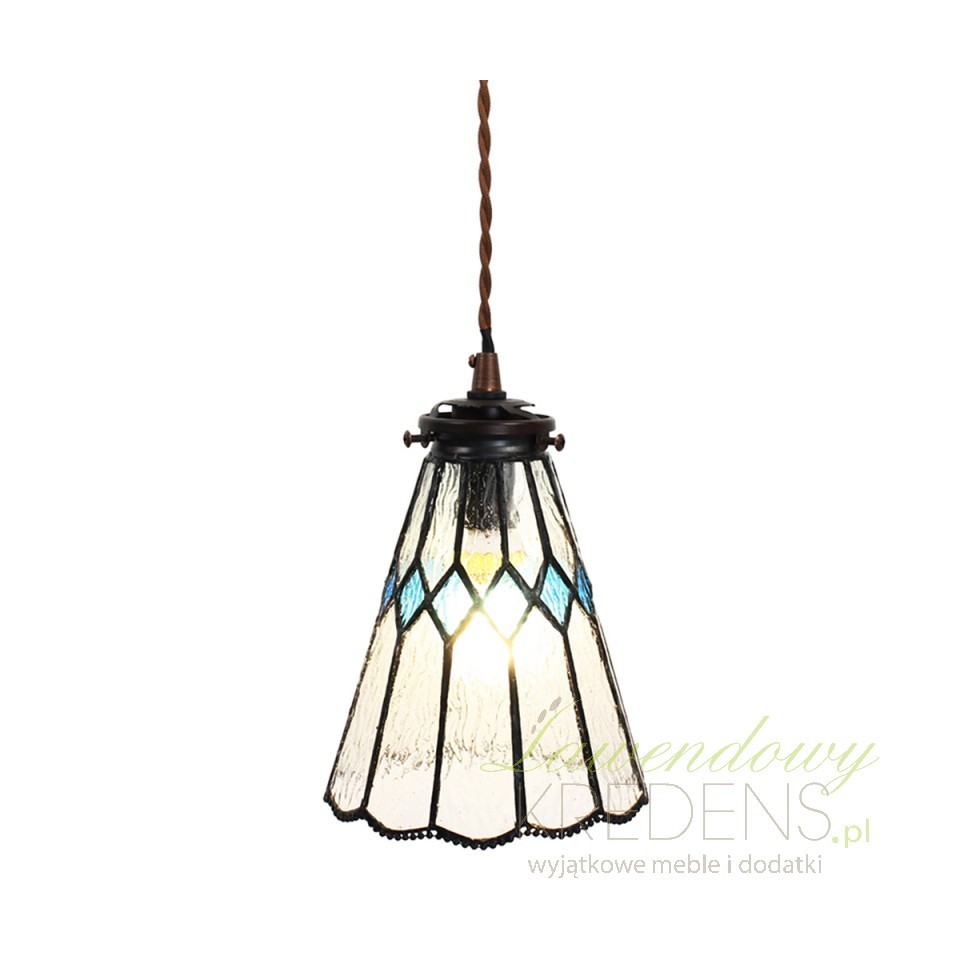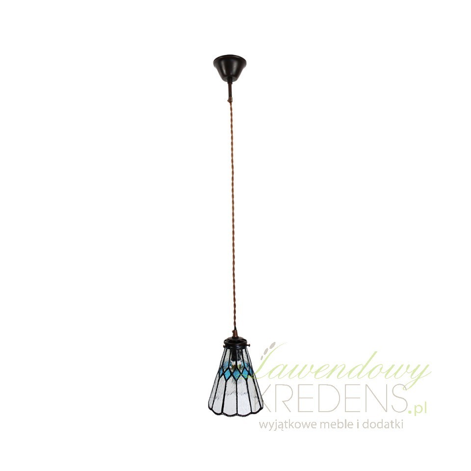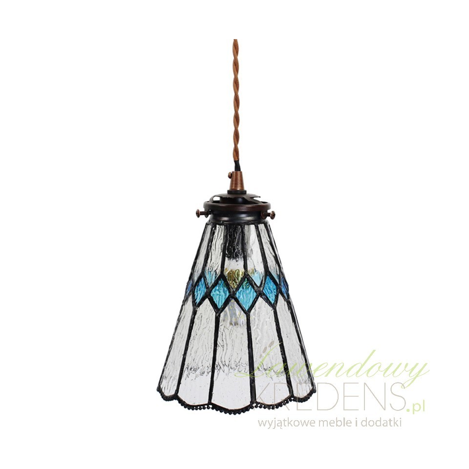 Wisząca lampa sufitowa Tiffany mała zachwyca dyskretnym designem i dbałością o szczegóły. Posiada klosz o szerokości 15 cm, wykonany z teksturowanego szkła w stonowanych odcieniach, uszlachetniony delikatnym, pofalowanym wykończeniem krawędzi i wzorem w niebieskie romby. Takie lampy witrażowe pozwalają by światło umieszczonej wewnątrz żarówki, pięknie rozpraszało się wokół. Lampy sufitowe Tiffany z kolekcji Clayre & Eef fenomenalnie harmonizują z klasycznym stylem umeblowania jak również z atmosferą wiejskiego domu.