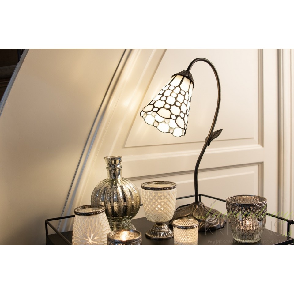 Lampa stołowa Tiffany kwiat rozprasza obficie światło po całym pomieszczeniu, dodając przyjazną, ciepłą atmosferę. Zainspirowana stylem z połowy wieku, ta jednopunktowa lampa w kształcie kwiatka, tworzy fenomenalne i klimatyczne wnętrza. Wykonana z białego szkła ozdobiona jest wzorami w kolorze brązowym. Wraz z charakterystycznie wygiętą nogą przypominającą łodygę zasługuje na miano oryginalnej lampy stołowej. Nasze lampy stołowe Tiffany od Clayre & Eef to szeroki wybór zjawiskowych elementów oświetlenia wnętrz!