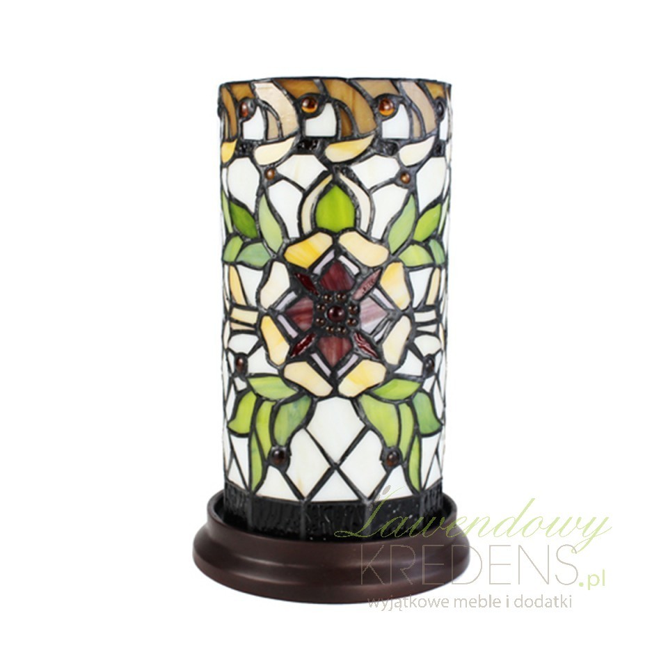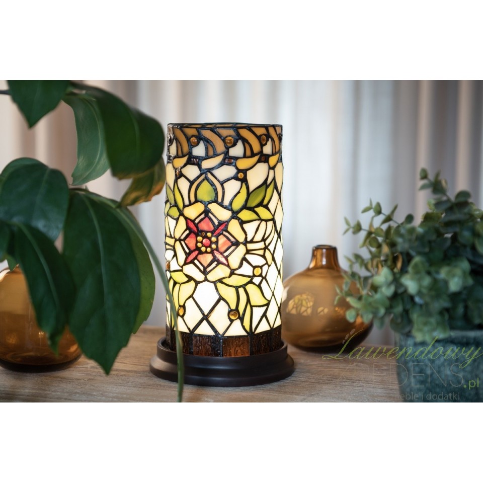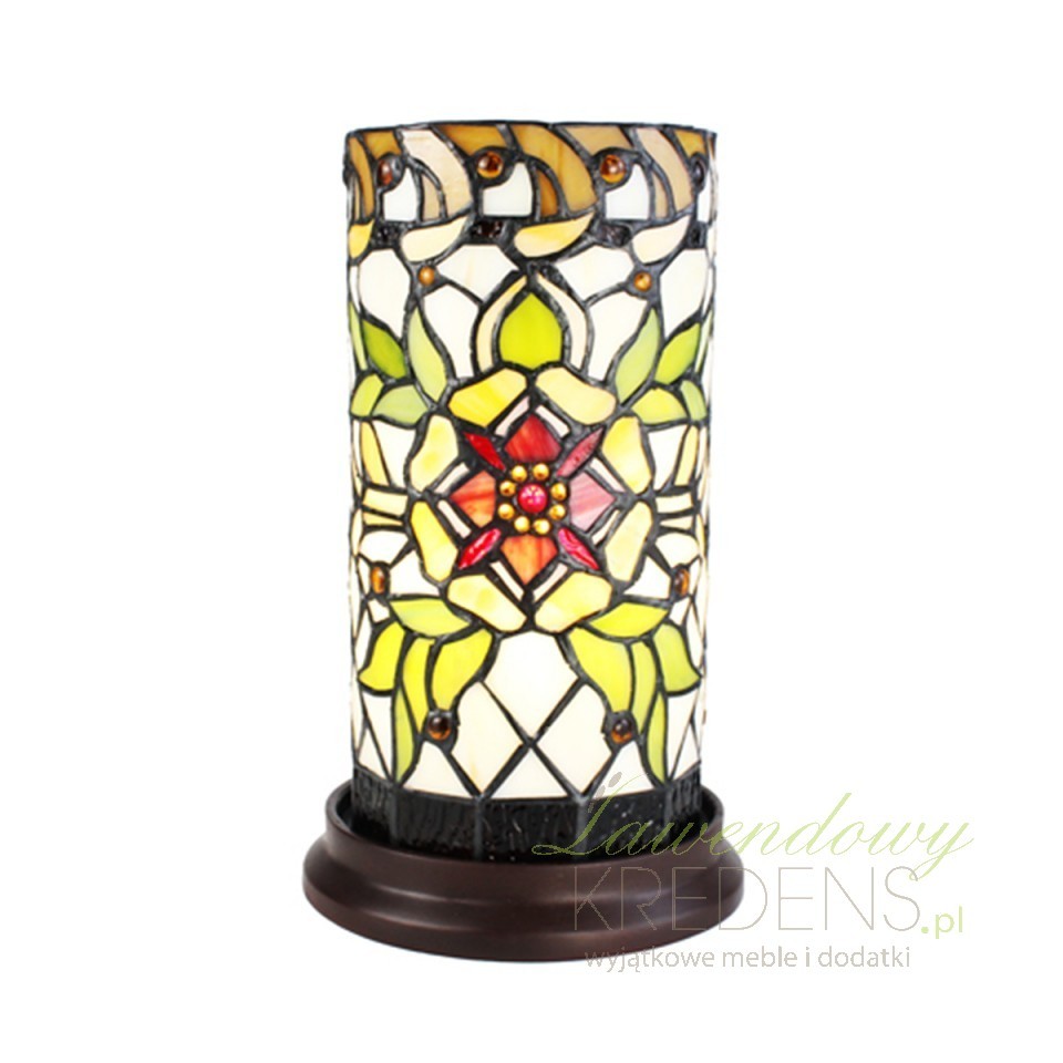 Lampa witrażowa Tiffany kolumna to jakby kawałek natury przeniesiony do wnętrza, gdzie klosz w kształcie okrągłej kolumny jest niczym witrażowa opowieść o zielonych liściach i czerwonych kwiatach.