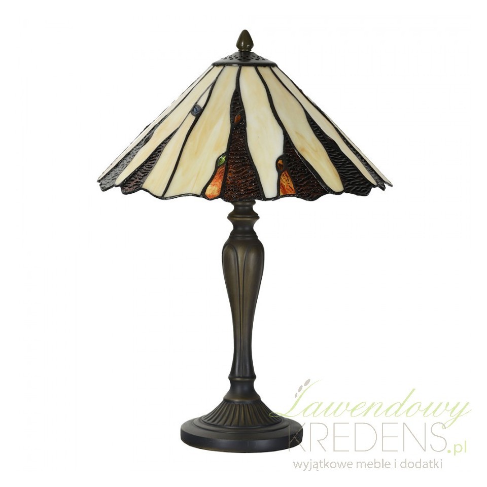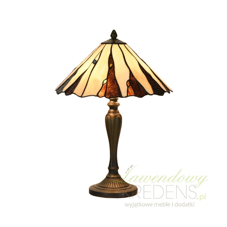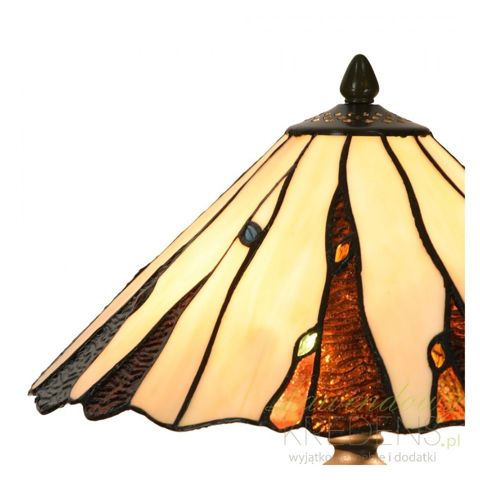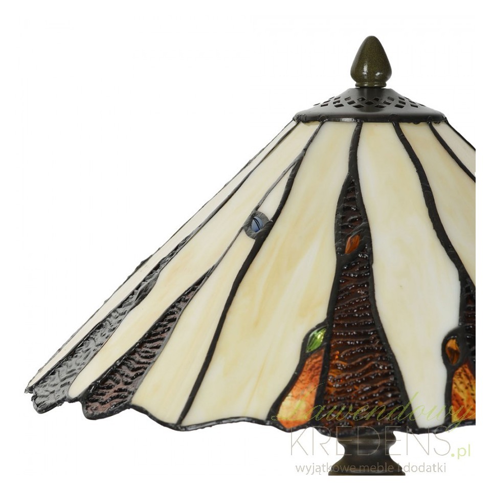Głównym elementem tej lampy jest misternie wykonany klosz, w którym dominują piękne odcienie kremowego i brązowego. Ręcznie ułożone elementy tworzą asymetryczny wzór, co nadaje lampie stołowej Tiffany niepowtarzalną estetykę. Każdy detal, starannie dobranej kolorystyki, jest ręcznie łączony, co podkreśla indywidualność i dbałość o detale.