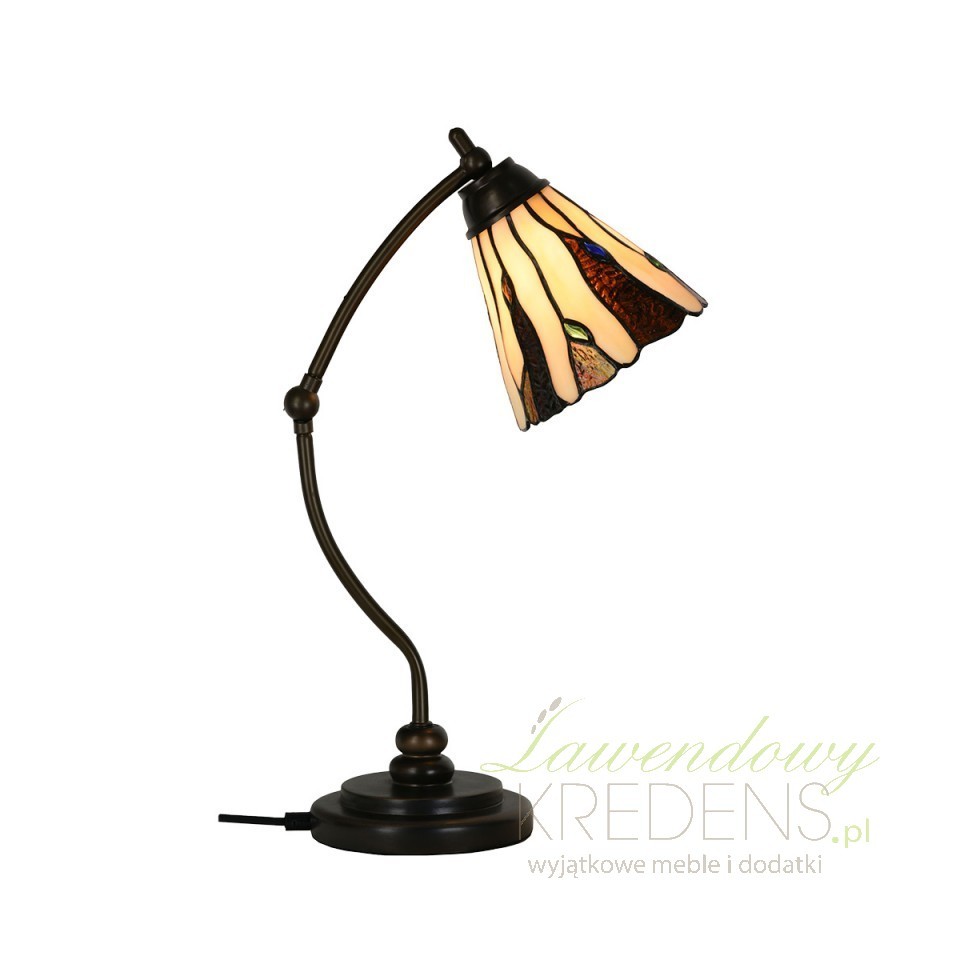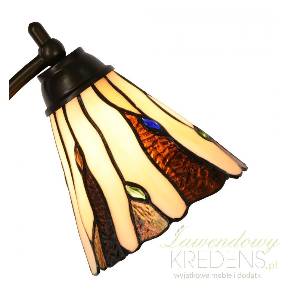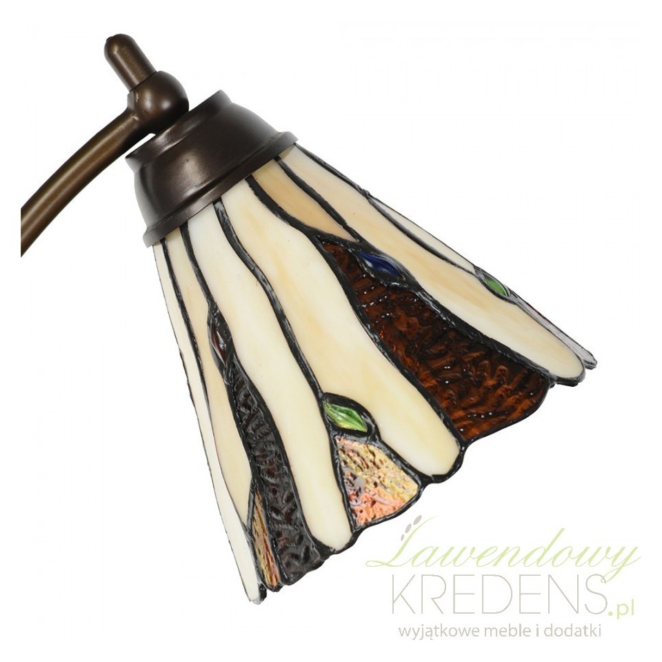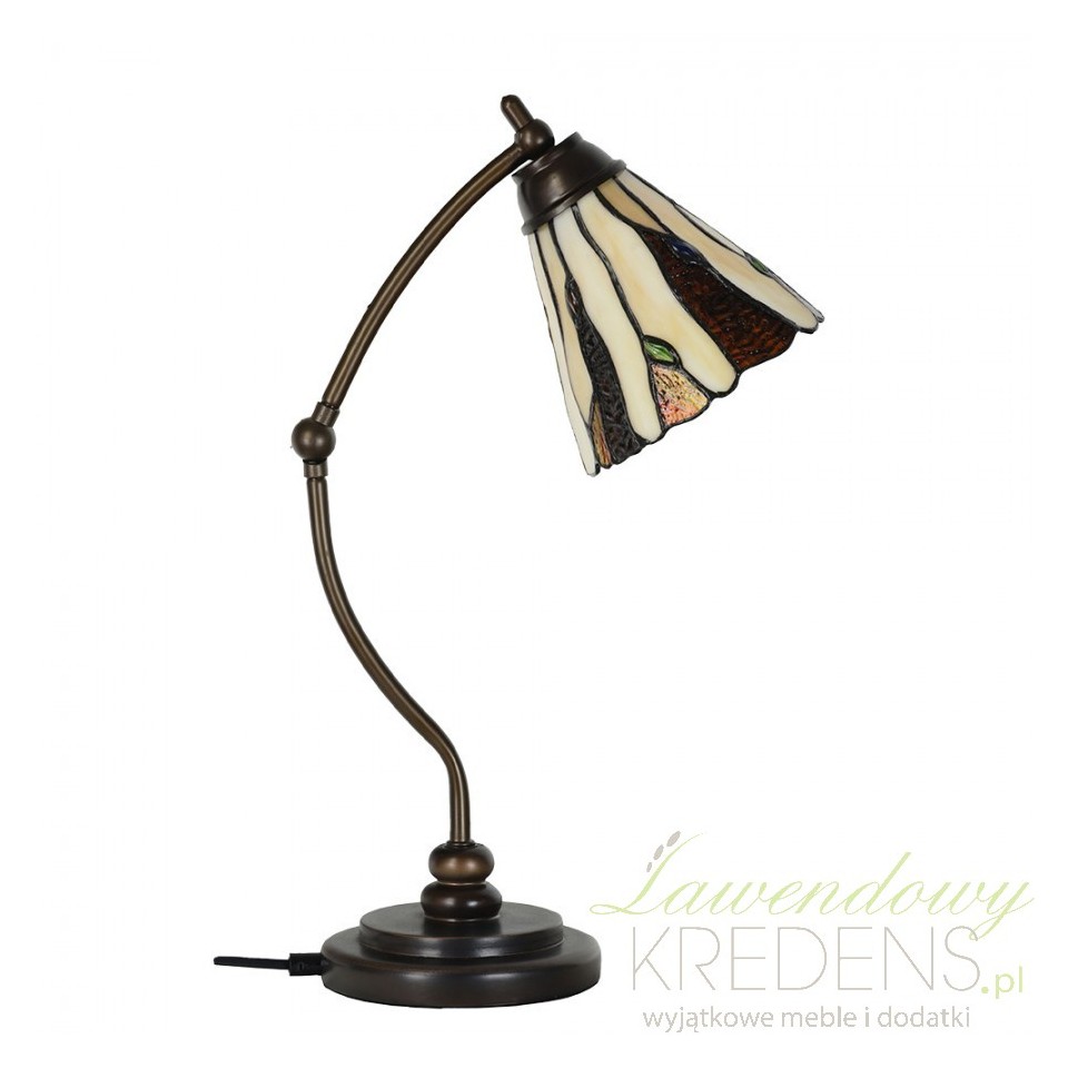 Zakrzywiona podstawa w ciemnym kolorze, podkreśla wykonanie tej lampy Tiffany. Witrażowy klosz w jasno beżowj kolorystyce z domieszką brązu stanie się uniwersalnym dodatkiem, oświetlającym wnętrze w każdy wieczór.